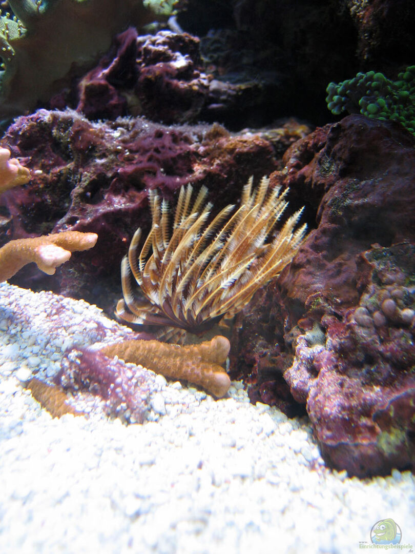 Fische: - 3 x Chromis viridis - grünes Schwalbenschwänzchen - 6 x Pseudanthias squamipinnis - Juwelen Fahnenbarsch - 3 x Pterapogon kauderni - Kardinalbarsch (eigene Nachzucht) - 2 x Amphiprion ocellaris - Falscher Clown-Anemonenfisch - 2 x Chrysiptera hemicyanea - Arzur Riffbarsch - 1 x Acanthurus leucosternon - Pazifik Wei??kehldoktor - 1 x Paracanthurus hepatus - Paletten Doktorfisch - 1 x Zebrasoma scopas - Brauner Segelflossen-Doktor - 1 x Labroides dimidiatus - Putzerlippfisch - [...]