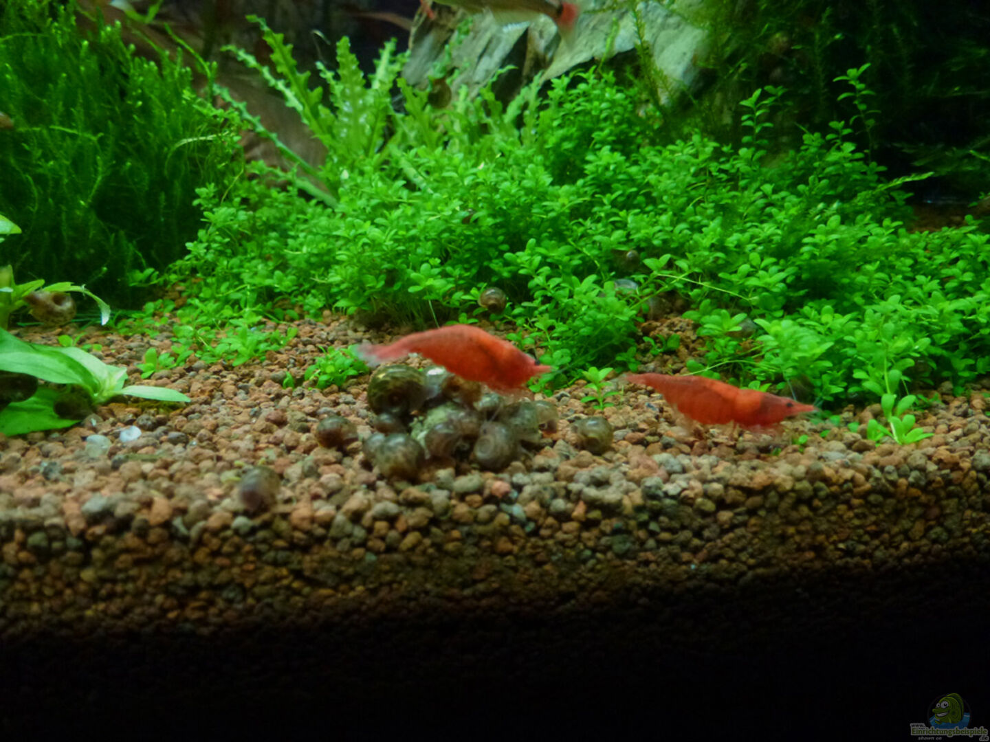 Sakura Champ Neocaridina heteropoda `Red` Anfangsbesatz 10 Stk., Nachwuchs mittlerweile ca. 15 Stk. Diese aus Japan stammende, sehr attraktive und beliebte Zwerggarnele kommt nicht in der Natur vor. Es gibt mittlerweile mehrere Zuchtvarianten. Die Männchen erreichen eine Länge von 2 cm, die Weibchen 2, 5 cm. Die Haltung und Zucht dieser Garnelen ist nicht schwer, da sie nach 4 - 6 Wochen Tragzeit ca. 20 - 40 fertig entwickelte Jungtiere entlassen. Man kann sie in Aquarien ab 12 l (besser [...]