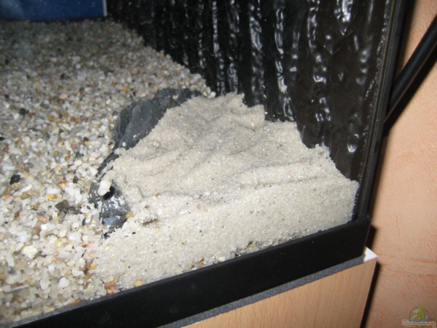 1x Wurzel 1x Kokossnusshöhle und ein paar Flu??kiesel 1x Sandecke in einer hinteren Ecke