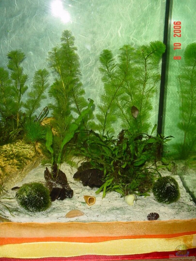 1 Steinhäuschen aus Kunstharz (inzwischen fast vollständig mit Javamoos zugewachsen) 1 Steinterasse aus Kunstharz um Sand und Kies zu trennen 1 Leuchtquarz 1 Picturestone 1 Versteinertes Holz Erlenzapfen Mangrovenholzstücke Muscheln und Bambusröhrchen in der Sandzone Schwimmringe um die Schwimmpflanzen an bestimmten Positionen halten zu können Blau-grünes Rohseidenpapier als Hintergrund