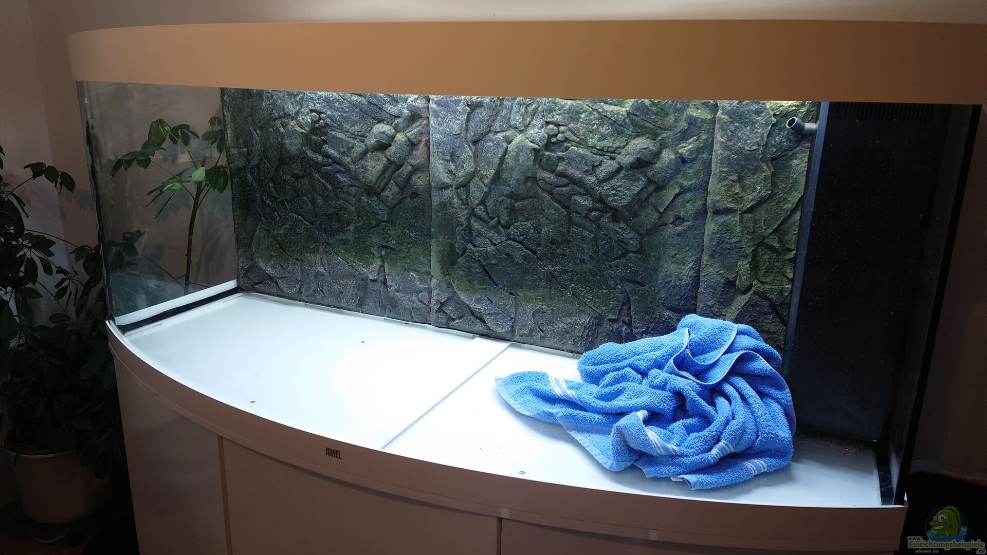 Wie üblich bei Vision Becken von Juwel eine gebogene Frontscheibe mit Sto??verklebung. Becken steht auf dem originalen Unterschrank von Juwel Unterschrank mit drei Türen, jede mit Push to Open Funktion. Dezente blaue indirekte LED Beleuchtung unter dem Schrank angebracht