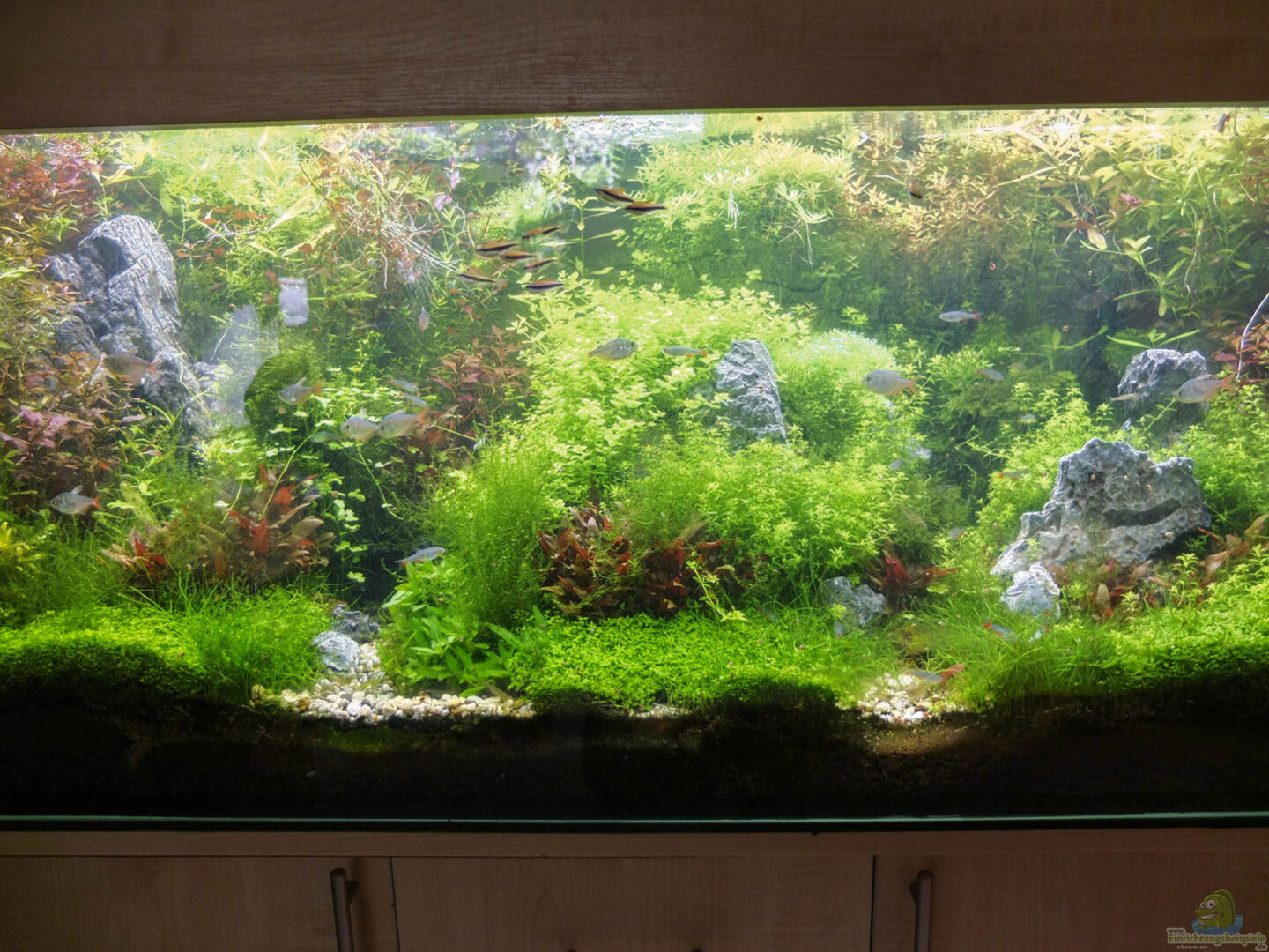 Aquarium 130x60x50 mit geschlossenem Leuchtenkasten in der Farbe des Aquariumschrankes. Aquariumunterschrank mit zwei Türen und drei Schubladen, Farbe Ahorn hell. Habe mich für ein 60 cm breites Becken entschieden, da man damit eine grö??ere Tiefenwirkug erziehlen kann.
