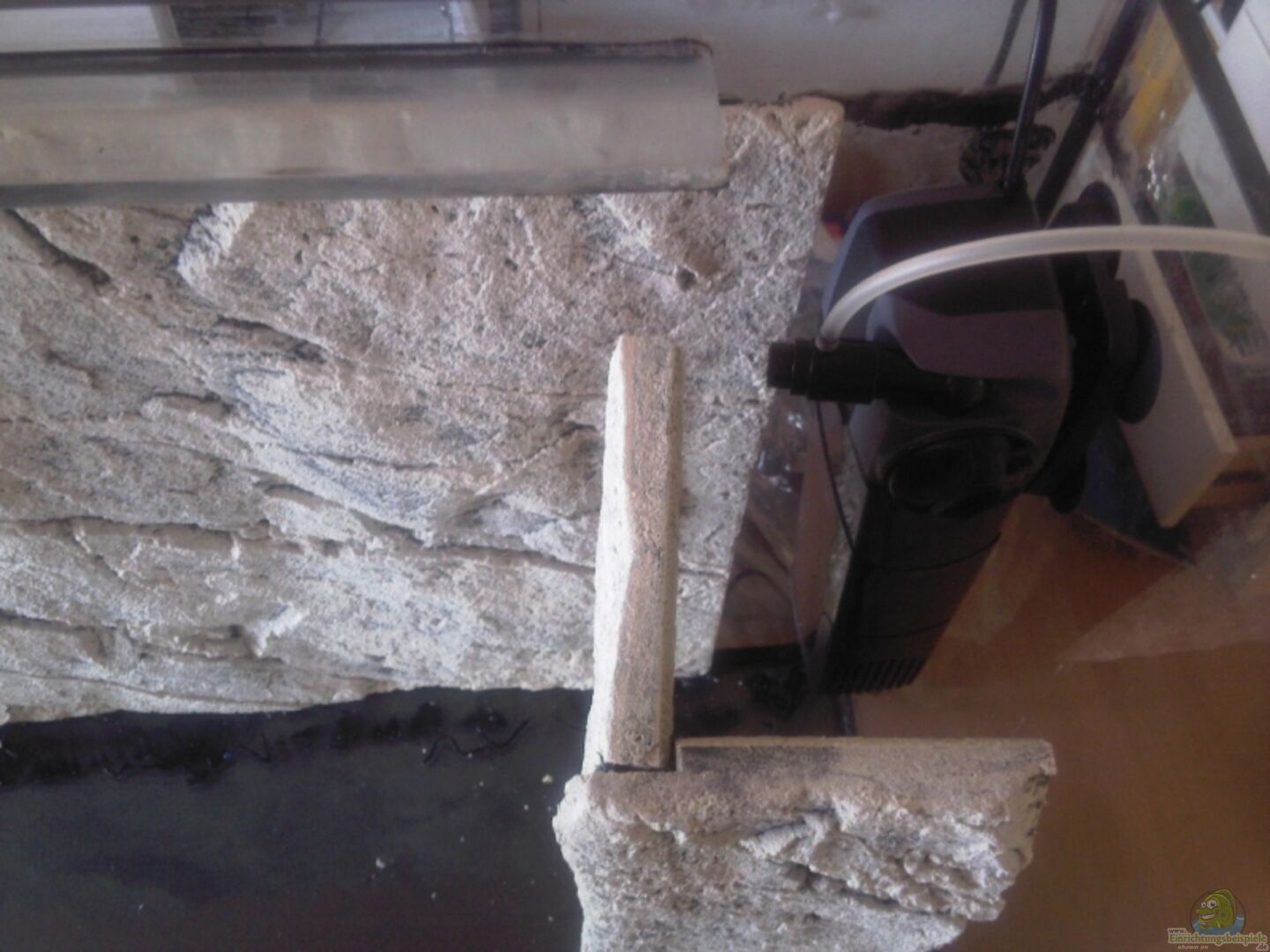 Aquarium aus 12mm Glas. Stossverklebt mit schwarzem Silikon, einer zusätzlichen Sicherheitsnaht innen und in der Mitte mit einer Querstrebe verstärkt.