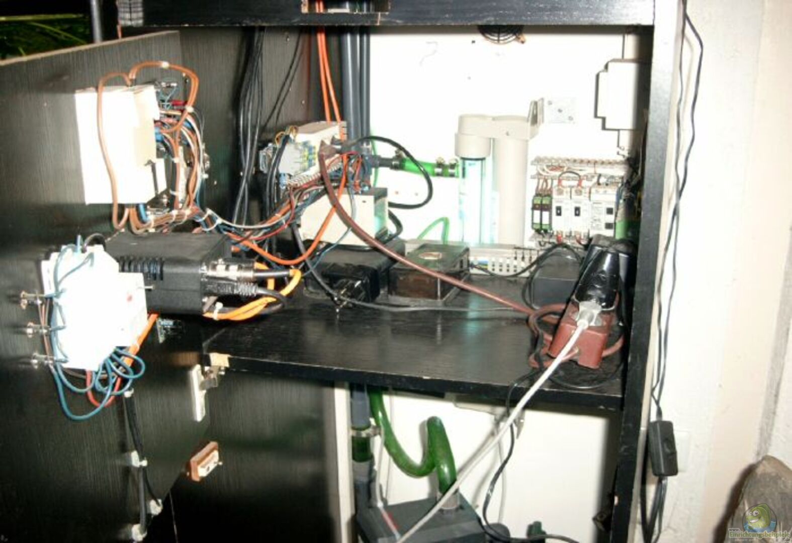1 Sp-3800 mit2000l/h sorgt für Oberflächenbewegung. Die gesamte Elektrik und der Au??enfilter befinde´n sich im Seitenschrank: 2 Heizungen á 300 W, mit separaten Steuergeräten und einer optischen Alarmanzeige sowie einer digitalen Temperaturanzeige. PH-Regler und Redox Regler von Zajac