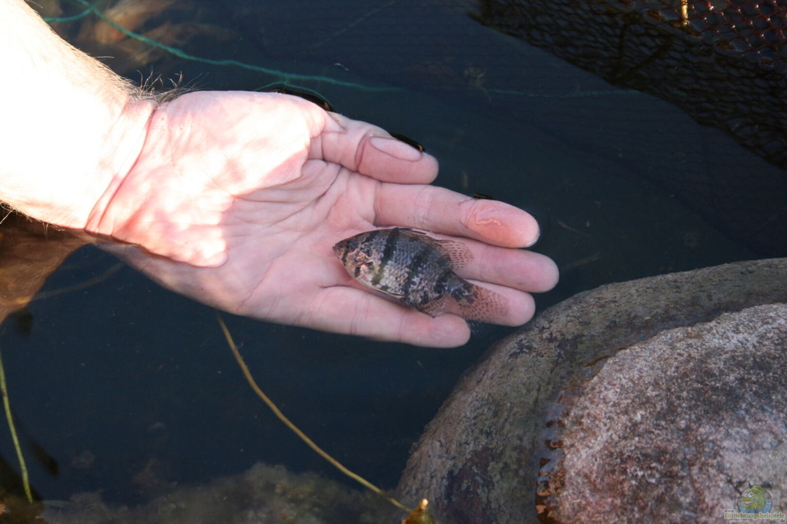 2x Gemeiner Sonnenbarsch (Lepomis gibbosus) unbekannte Anzahl Gründlinge (Gobio gobio) unbekannte Anzahl Scheibenbarsche (Enneacanthus chaetodon) 12x China-Makropode, Macropodus ocellatus, Zu Besuch: Teichfrosch, Erdkröte, Grasfrosch die alle ablaichen und sich reichlich vermehren. Verschiedene Libellenarten.