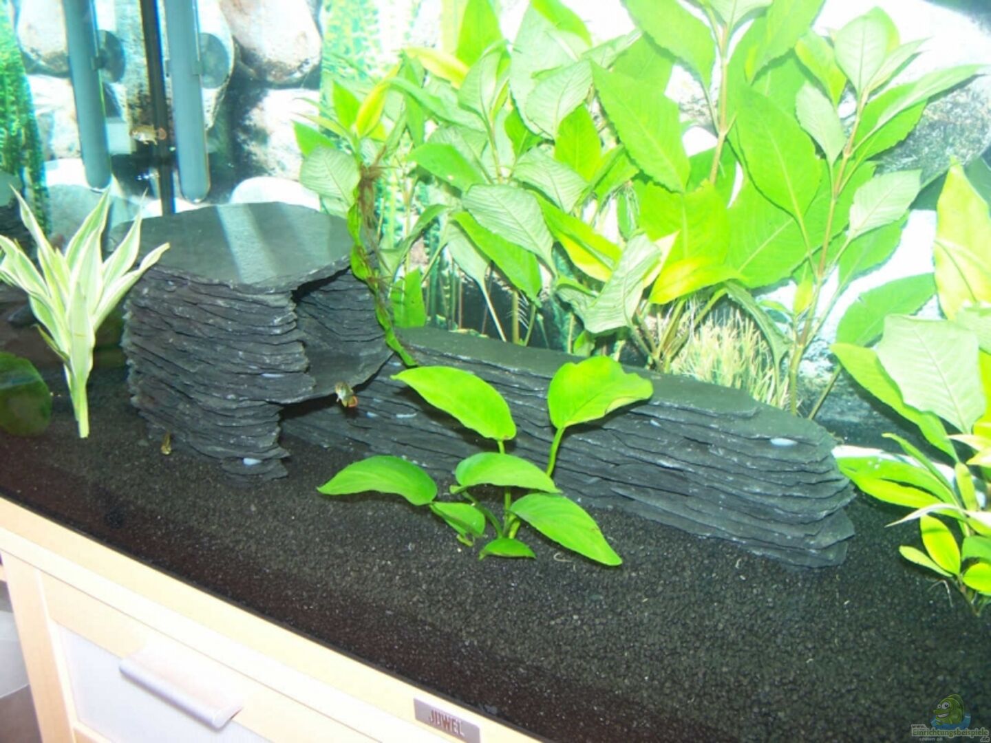 Selbsgebaute Deko mit 2 Höhlen (1 offen zum durchschwimmen) aus Schieferplatten mit Aquarien-Silikon verklebt
