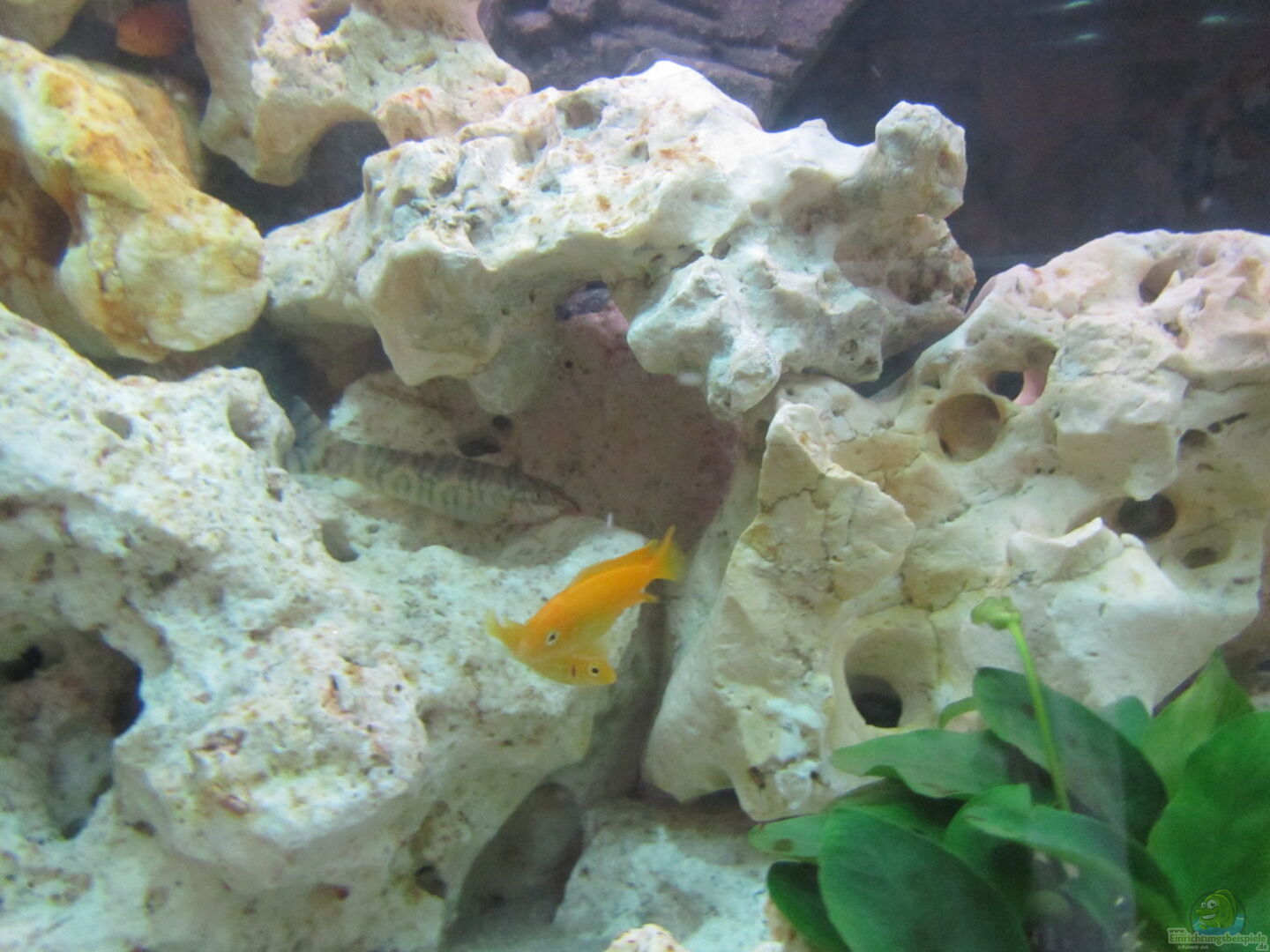 1/3 Labidochromis Hongi 2/3 Pseudotropheus Saulosi 1/3 Labidochromis yellow 12 Geweihschnecken 3 Turmdeckel Schnecken 1 Netzschmerle (duck mich weg ;) Gastarbeiter aus dem Raum Himalaya, Indien. Der letzte Fisch aus meinem vorigen Becken, keiner aus meinem Freundes Kreis mit Aquarium, wollte ihn haben. Und ich gestehe, ich finde diesen Fisch Klasse.