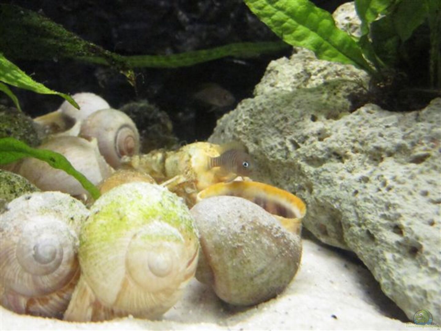 Neolamprologus multifasciatus (1m/3w) - Schneckenbarsch 2 ältere Jungtiere, Geschlecht unbekannt Turmdeckelschnecken und ein paar Blasenschnecken