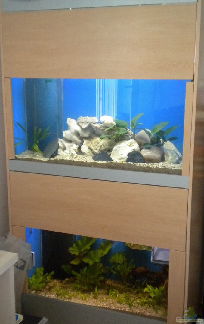 Becken ist Teil eines Aquarienschrankes (Sonderanfertigung), das aus einem 200 l Becken (oben) und einem 220 l Becken (unten) besteht. Die Blenden über den Becken sind magnetisch, die Rück- sowie Seitenwände beider Becken sind mit blauer Farbe bestrichen.