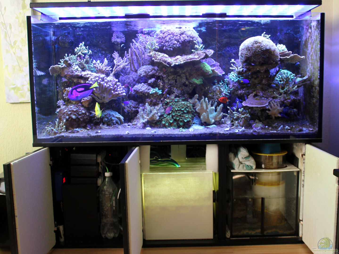 1, 2cm floating Wei??-Glas, sto??verklebt mit ??berlaufschacht und zwei Auslässen in der Mitte. Der Unterschrank ist nach Ma??, nur 55cm hoch und das Becken ist komplett offen mit 2 Querstreben. Die Rückseite des Beckens wurde mit schwarzen Acryllack bemalt. Das Gesamtwasservolumen Netto beträgt inkl. Technik ca. 480 Liter abzüglich des Lebendgesteins.