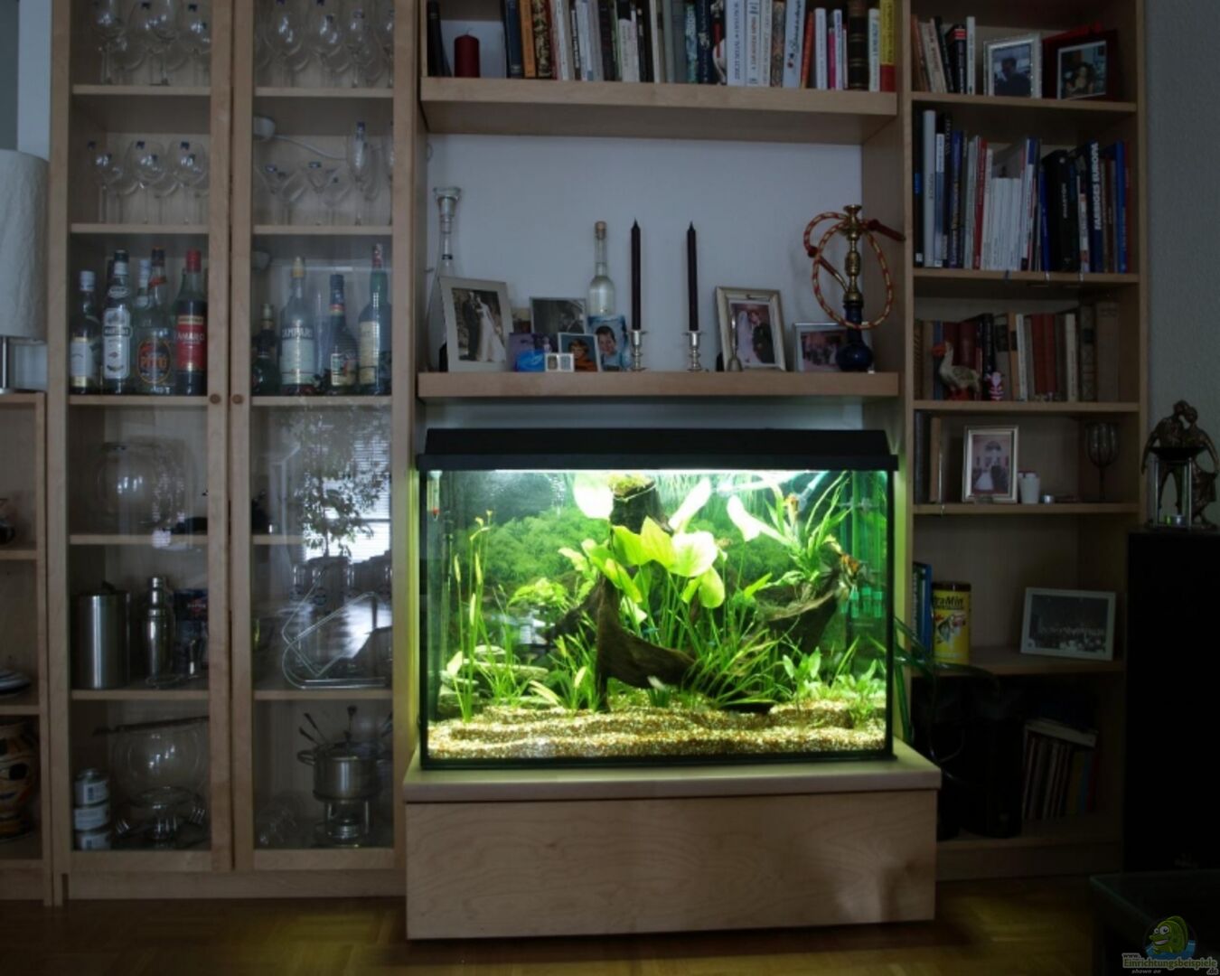 10 mm Glas mit Sto??verklebung, Isomatte als Beckenauflage Das Becken ist umrahmt von 2 Ikea Billy Regalschränken: links ein 80cm Vitrinenschrank, rechts ein ´offener´ 60cm Regalschrank. Zwischen den beiden Regalen ist 110cm Platz. Diesen habe ich mit 3 110cm ´Lack´ Regalen auf im oberen Bereich ´überbrückt´. Der untere Bereich ist für das Aquarium reserviert. Dieses steht auf 3 Ziegeldoppelsäulen (12 Standardziegeln) und einer 5cm Arbeitsplatte im passenden Buchenton. Als Verblendung [...]