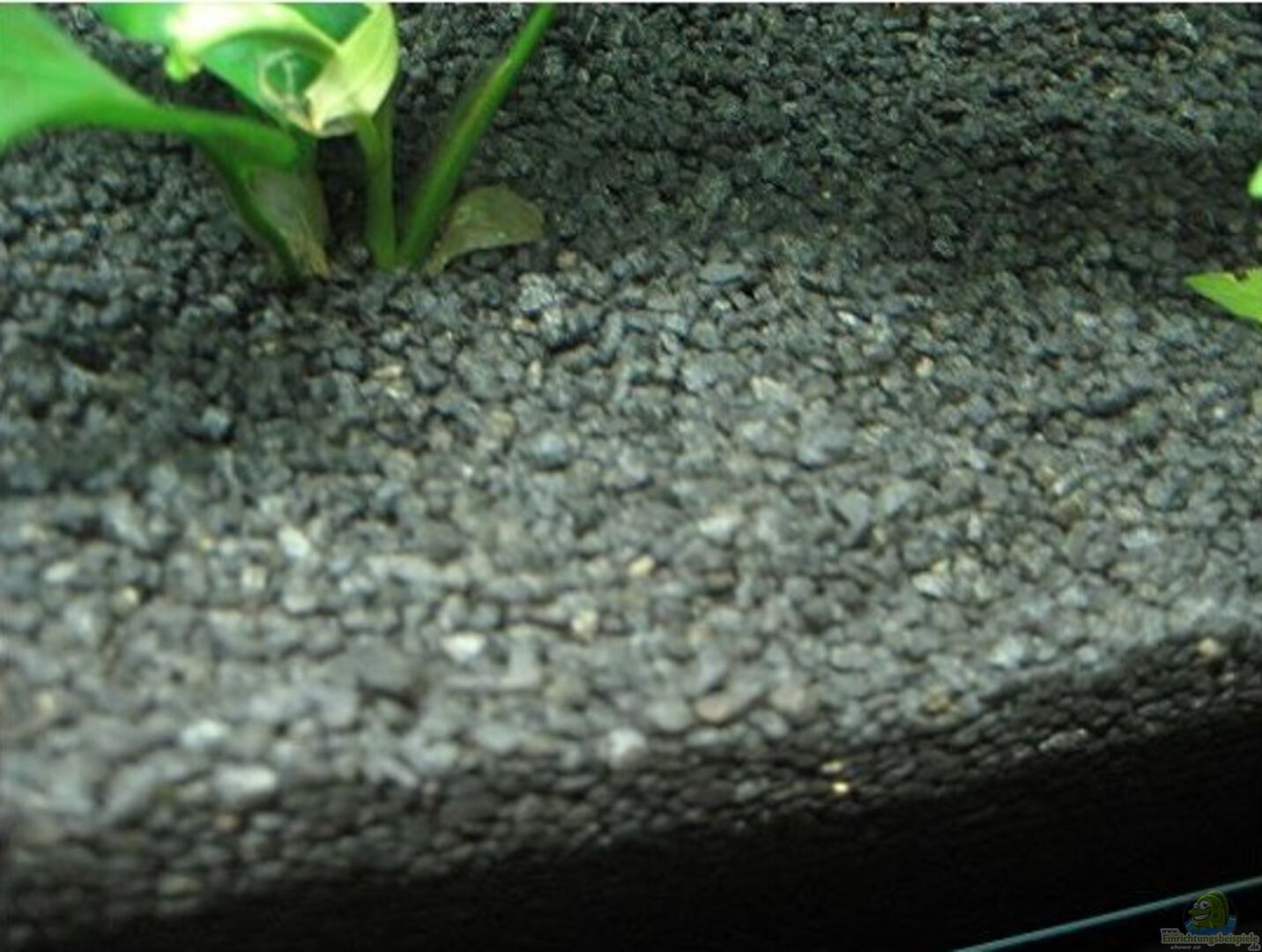 ein Stück immitierte Holzrinde bzw. ausgehöhlter Baumstamm aus Plastik als Höhle oder Versteckmögklichkeit Hintergrundfolie mit hellen Felsen darauf schwarzer Dekokies als Bodengrund