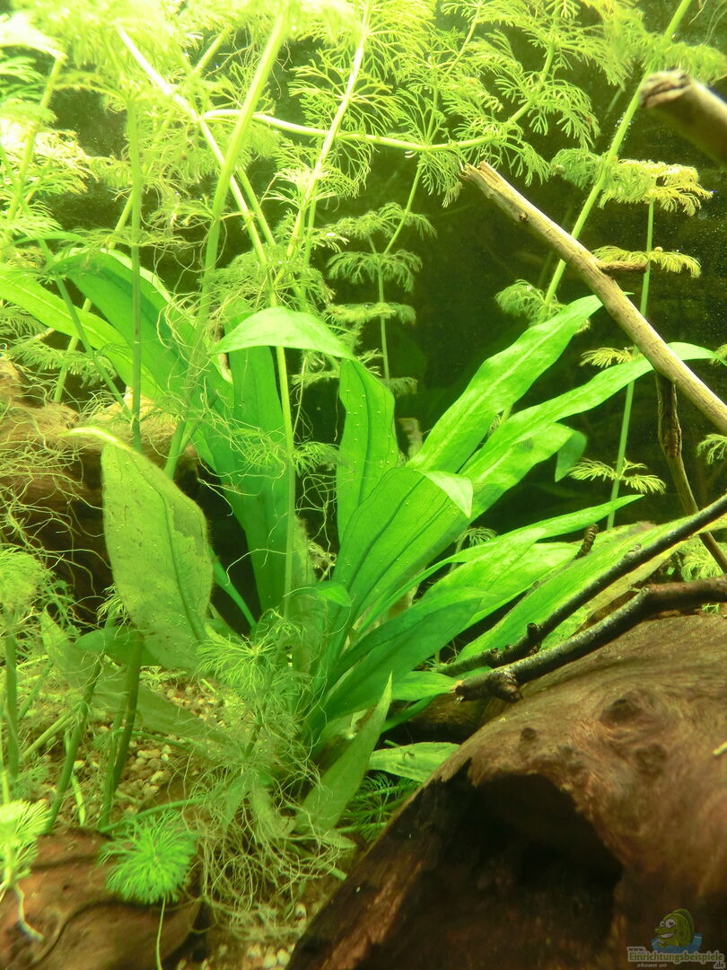 Vordergrund: -Cryptocoryne wendtii -Cryptocoryne wendtii, Farbschlag mit bräunlichen Blättern Beide absolut genügsam, aber langsam wachsend -Lilaeopsis novaezelandiae, Neuseelandgras -Marsilea hirsuta, Zwergkleefarn, sehr hübsch, bildet in meinem Aquarium zwar nicht die namensgebenden Klee- sondern vielmehr kellenartige Blätter aus, wächst aber sehr schnell und wertet aber zusammen mit dem Neuseelandgras den Vordergrund optisch bedeutend auf. Hintergrund: -Hygrophila corymbosa, [...]