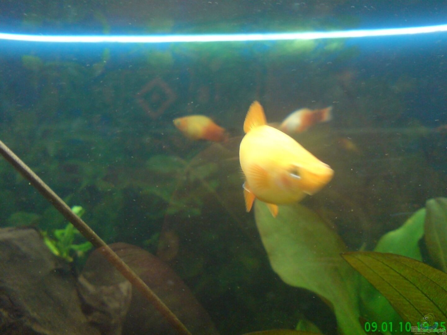 16 Schwertträger (3 Männchen + 14 Weibchen ) , 1 grosser Neon ( gnaden Brot ) , 1 Gelbe Saugschmerle , 1 Bergwasser Fächergarnele , 4 Antennewels Babys , 4 Panzerwelse ( 2 Schleier , 2 Albino ) , 5 Platys ( 1 M + 4 W ) , 1 Hexenwelse , einige Posthornschnecken , 6 grosse Apfelschnecken ( 3 M + 3 W ) ,