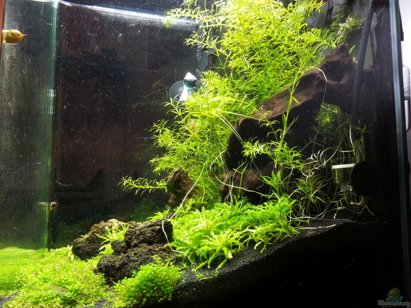 Die Vorrichtung des Hamburgermattenfilter ist mit Schieferstückchen beklebt. Die selbstgebaute Schieferrückwand ist ebenfalls fest eingeklebt. Die Seiten der Rückwand sind nicht komplett geschlossen. So haben die Garnelen die möglichkeit sich dahinter zu verstecken. An dieser Stelle gab es schon interessante Beobachtungen. Mittlerweile sucht hat auch die Wasserpest die Lücken entdeckt und wächst fröhlich dahinter weiter.