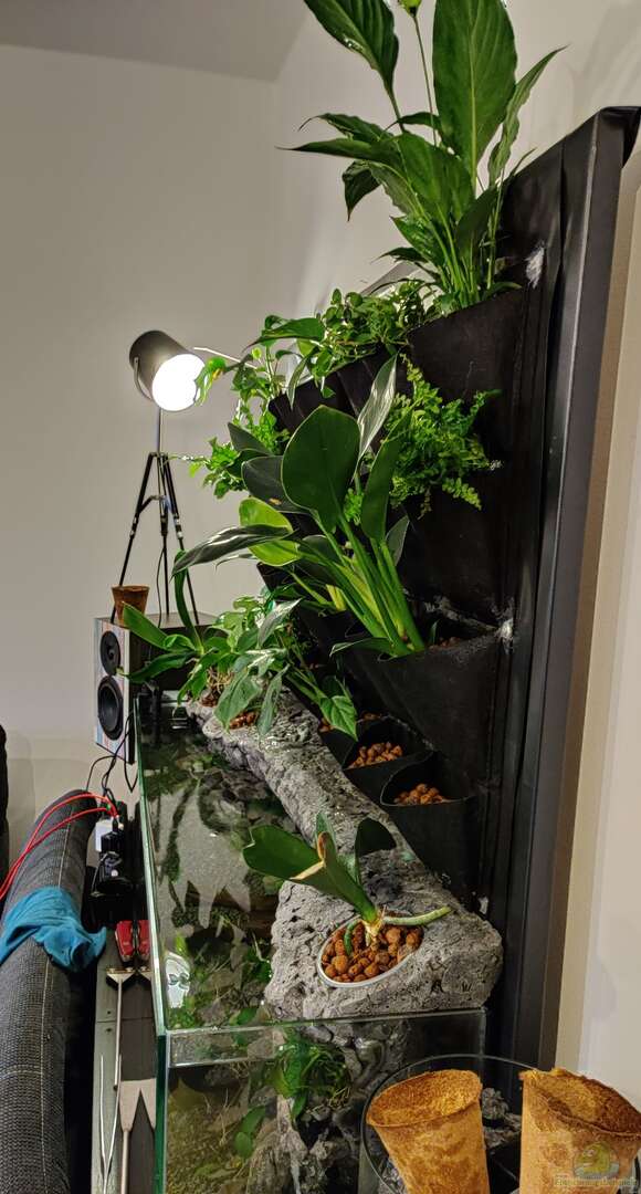 Auf der Rückseite des Aquariums befindet sich ein Alu-Stecksystem, welches mit einer Teichfolie bespannt ist. Die Teichfolie geht bis ins Aquarium und dichtet somit die Rückwand vollständig ab. Um einen ??bergang zwischen Aquarium und Rückwand zu schaffen, wurde eine 3D-Rückwand mit Montageschaum gestaltet. Dort befindet sich neben drei Einfassungen für Pflanzen im Landteil ebenfalls die Pumpe, welche mit einer Zeitschaltuhr gesteuert mehrere Male am Tag die Rückwand mit Aquariumwasser bewässert. [...]