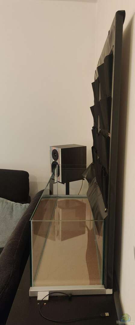 Auf der Rückseite des Aquariums befindet sich ein Alu-Stecksystem, welches mit einer Teichfolie bespannt ist. Die Teichfolie geht bis ins Aquarium und dichtet somit die Rückwand vollständig ab. Um einen ??bergang zwischen Aquarium und Rückwand zu schaffen, wurde eine 3D-Rückwand mit Montageschaum gestaltet. Dort befindet sich neben drei Einfassungen für Pflanzen im Landteil ebenfalls die Pumpe, welche mit einer Zeitschaltuhr gesteuert mehrere Male am Tag die Rückwand mit Aquariumwasser bewässert. [...]