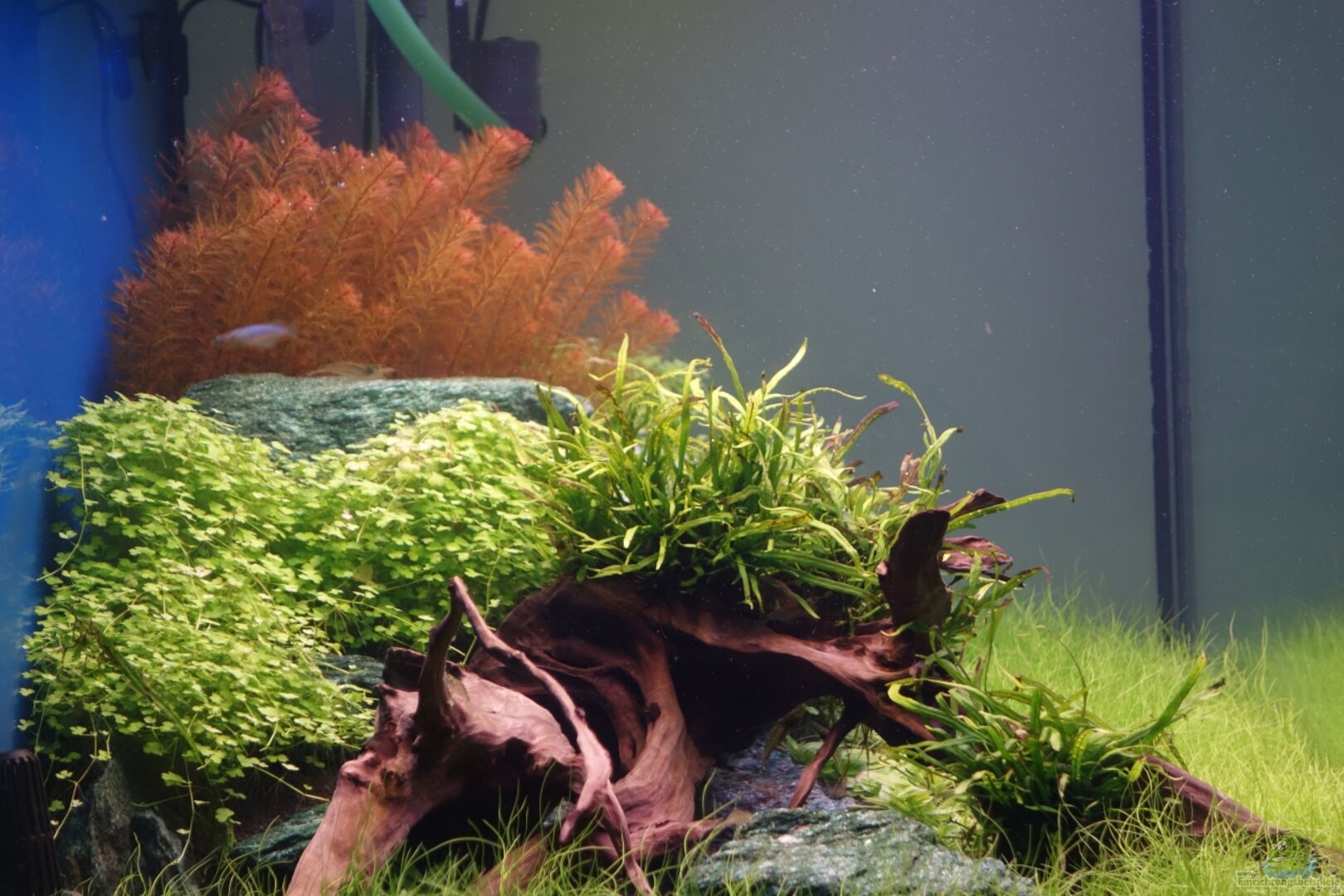 Diese Mal setze ich alle Pflanzenarten aus dem Tropica Programm ein. Vordergrund: Eleocharis sp. 'mini' . 10 Töpfchen Mittlerer Bereich: Hydrocotyle tripartita 10 Töpfchen Microsorum pteropus 'Trident' auf dem Holz 7 Töpfe Staurogyne repens. 10 Töpfchen Hintergrund bzw, auf dem "Hügel": Myriophyllum mattogrossense 'Red', 5 Töpfchen Rotala macrandra. 2 Töpfchen