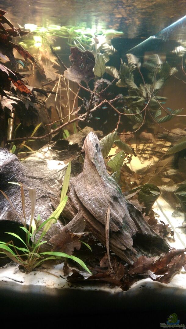 Dieses Becken ist mein erster Versuch ein Becken gemä?? den Anforderungen der Biotopaquaristik einzurichten und zu betreiben. Ich habe mich bemüht nach bestem Wissen die Uferzone eines Schwarzwasserflusses/-baches des "Rio Negro"-Gebiets nachzustellen und meinen Pfleglingen ein möglichst naturnahes Biotop einzurichten. HIerfür habe ich mich vor allem an Unterwasseraufnahmen aus dem "Rio Negro"-Gebiet oritentiert. Die eingesetzten Tiere kommen alle im Gro??raum des [...]