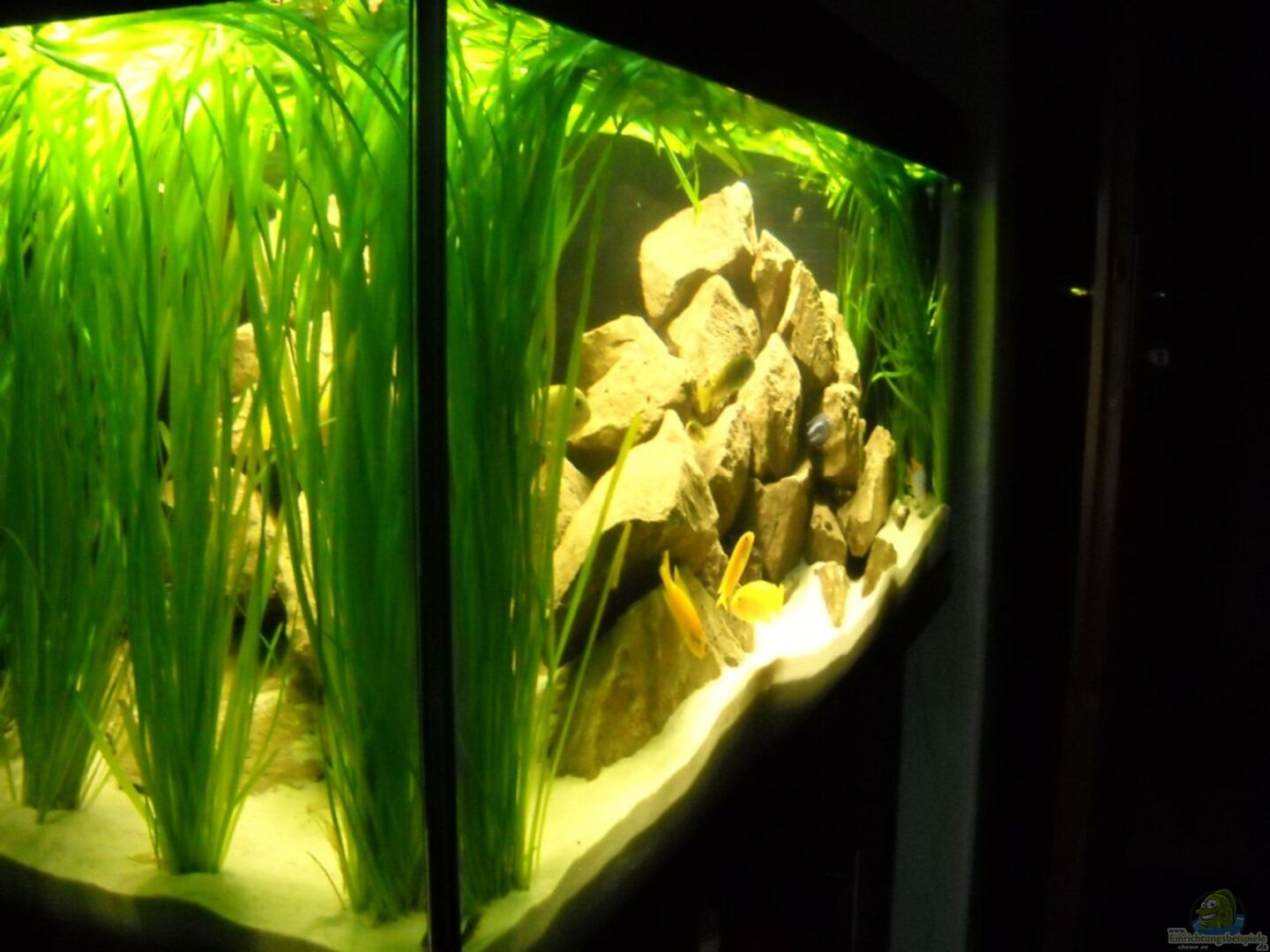 Das Becken ist ein Juwel Rio 240 im Farbton "Nuss". Den Innenfilter der ab Werk eingeklebt ist habe ich entfernt. Auf der Bodenscheibe liegt eine 2 cm dicke Styroporplatte mit den Ma??en 110x35 cm die als Puffer zwischen den Steinen und dem Glas dienen soll. Zwischen dem Becken und dem Unterschrank befindet sich noch eine 5mm Thermounterlage. Die Rückwand sowie die rechte Seitenscheibe wurden mit schwarzer Folie und JBL Fixol beklebt. Das Becken ist mit Jungfischen und Halbstarken [...]