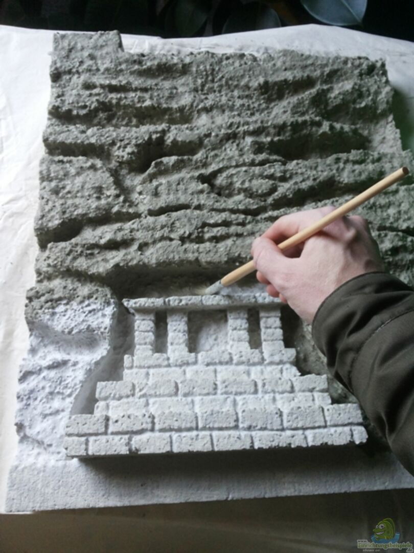 Selbstgebaute Rück- und Seitenwand. 5 cm dicke Styroporplatten wurden im ersten Arbeitschritt auf die passenden Ma??e zurechtgeschnitten, im nächsten Schritt das Design mit Filzstift grob markiert. Danach wurden die Vertiefungen herausgeschnitten und gekratzt (sehr mühsame und viele statisch aufgeladene Styroporbröckchen verursachende Arbeit). Die groben und noch sehr unnatürlich wirkenden Formen wurde durch Bearbeiten mit einem Hei??luftfön etwas geglättet und vertieft. Neben der Rückseite [...]