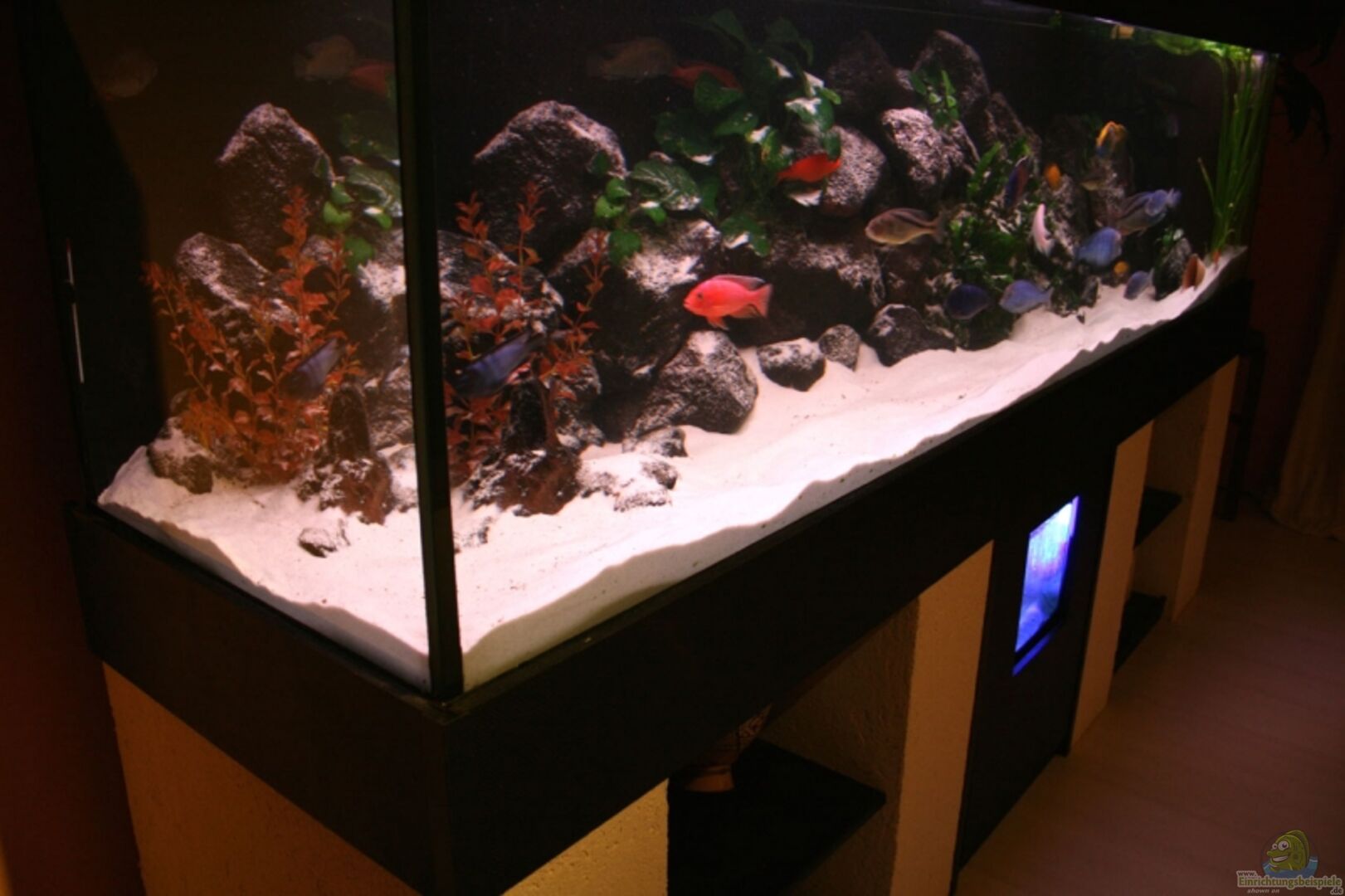 Kompletter Eigenbau der Anlage, Unterbau, Rahmen, Selbstgebaute Abdeckung aus wasserfestem Multiplex, 4 Abdeckplatten, Alu-Schienen in denen die Beleuchtung verschiebbar, oder komplett entnehmbar bleibt... Spezieller 2-Kammer ECK-Mattenfilter, und 60cm Becken als Einschub auf Schublade. Davor eine Tür mit Ausschnitt, dass man die Jungfische im kleinen Becken auch betrachten kann..