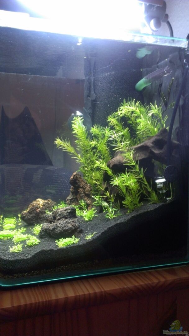 Die Vorrichtung des Hamburgermattenfilter ist mit Schieferstückchen beklebt. Die selbstgebaute Schieferrückwand ist ebenfalls fest eingeklebt. Die Seiten der Rückwand sind nicht komplett geschlossen. So haben die Garnelen die möglichkeit sich dahinter zu verstecken. An dieser Stelle gab es schon interessante Beobachtungen. Mittlerweile sucht hat auch die Wasserpest die Lücken entdeckt und wächst fröhlich dahinter weiter.