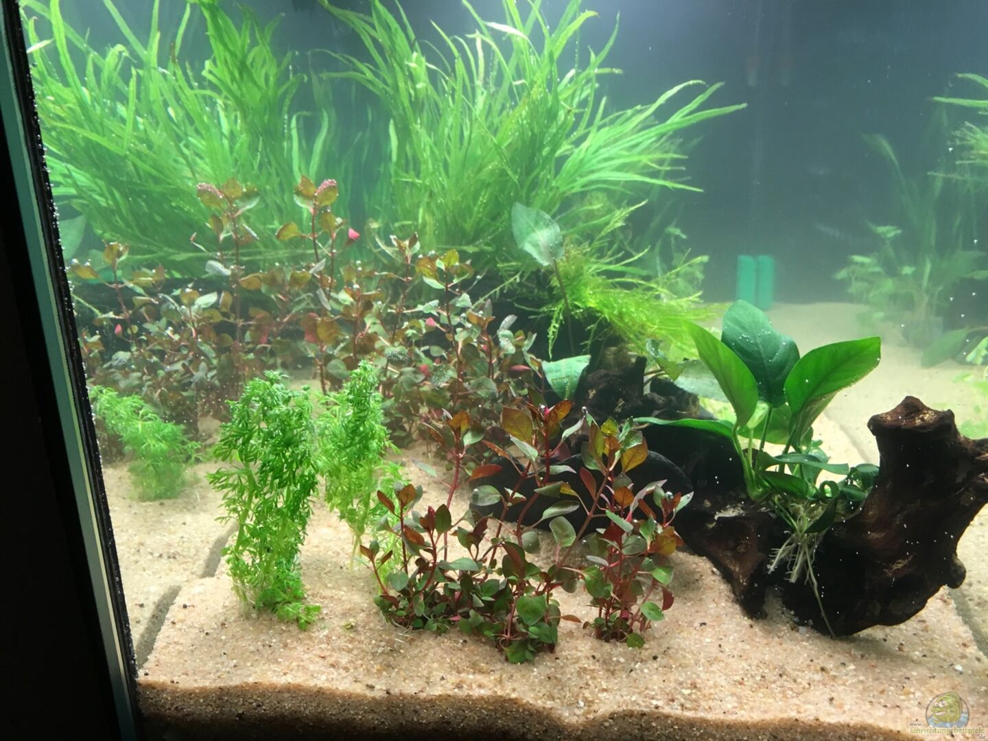 Alles pflegeleichte Pflanzen: Hintergrund: Vallisneria torta Ludwigia palustris Limnophila sessiliflora Mittelgrund: Cryptocoryne wendtii Vordergrund: Anubias Spiky-Moos Hydrocotyle cf. tripartita Blickfang in der Beckenmitte: Microsorum pteropus Trident
