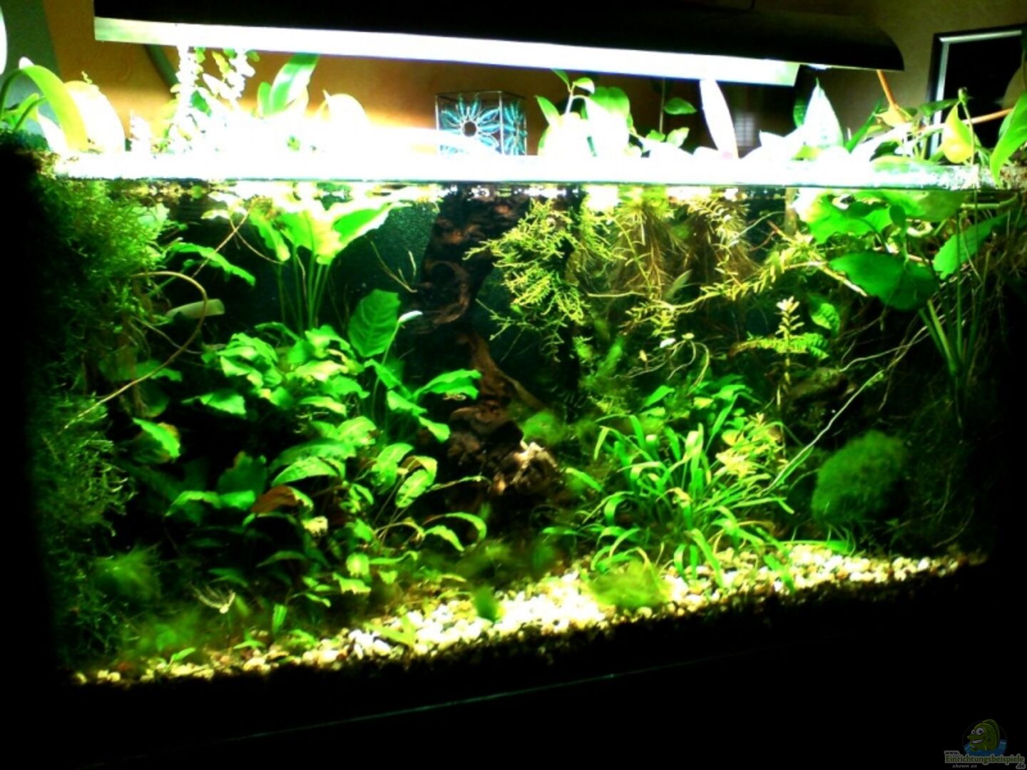 Das Becken ist offen und steht auf einem selbst gebauten Unterschrank. Bis August 2007 war das Aquarium mit einer Scheibe abgedeckt, hatte eine 15W Leuchtstofflampe, bekam kein CO2 eingeleitet und wurde, au??er über das Futter, nicht gedüngt. Ging auch, war aber nicht so schön.