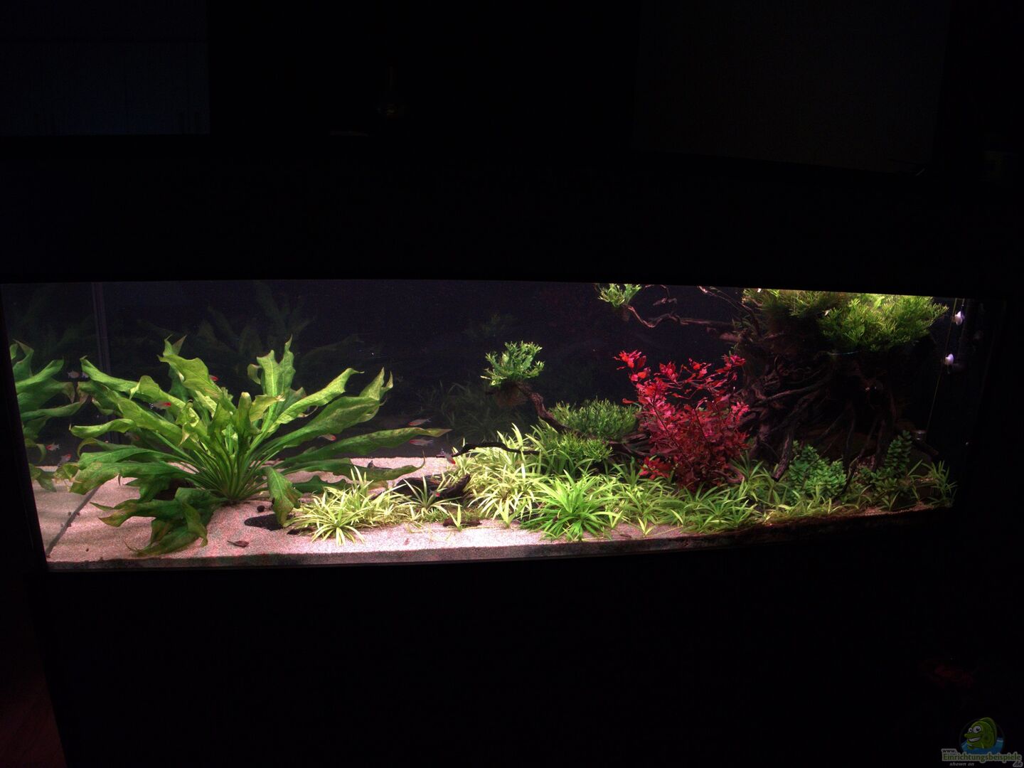 Selbstgemachter Raumteiler mit einem Glasbecken der Ma??e 150x50x50. Der Raumteiler wurde aus Leimholzplatten gebaut und mit Parkett und Zierleisten verkleidet.