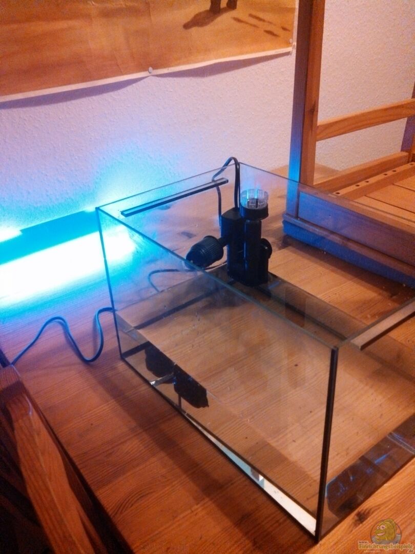 geschenktes 25 liter Aquarium mit Sto??verklebung Selbstgebaute 16 Watt LED Leuchte (8 Watt Wei?? / 8 Watt Blau) Wasserwechsel jede Woche á 2 Liter Verdunstetes Wasser wird mit Osmosewasser aufgefüllt