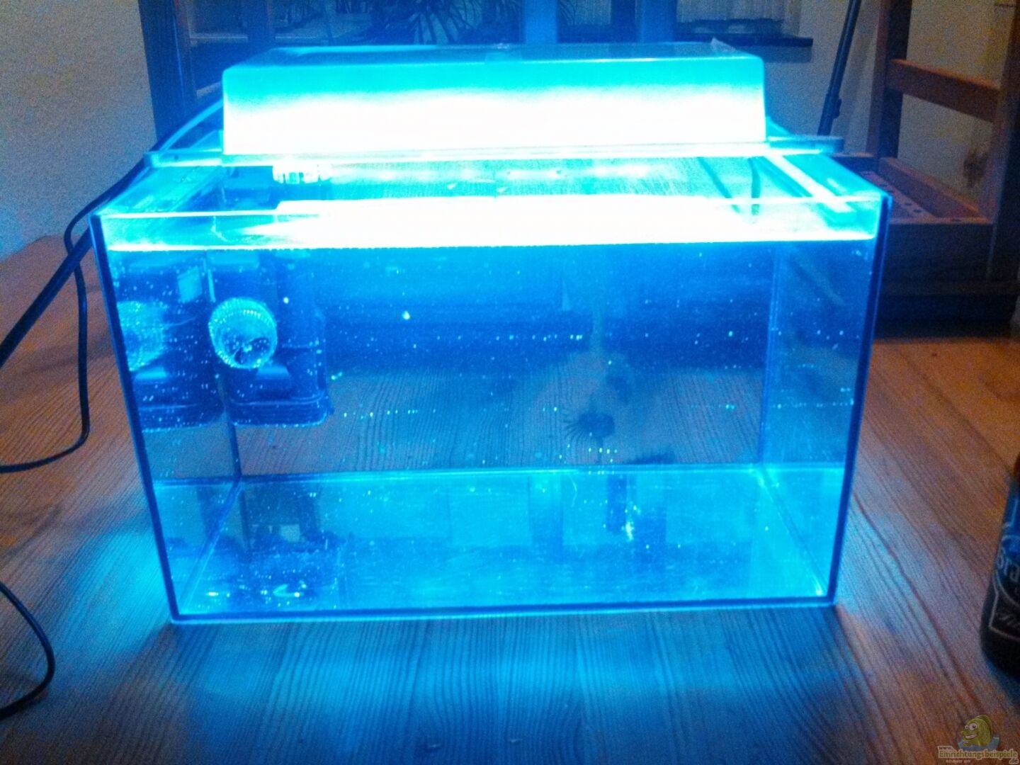 geschenktes 25 liter Aquarium mit Sto??verklebung Selbstgebaute 16 Watt LED Leuchte (8 Watt Wei?? / 8 Watt Blau) Wasserwechsel jede Woche á 2 Liter Verdunstetes Wasser wird mit Osmosewasser aufgefüllt