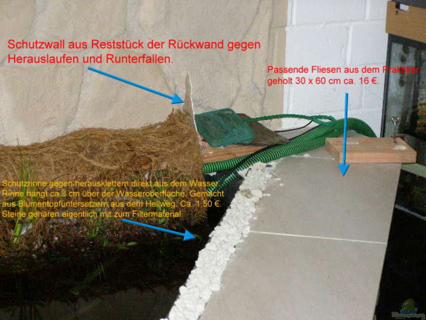 Selbst entworfen und gefertigt. Holzständerwerk mit Stryropor ausgekleidet und mit Deckplatten versehen und verstärkt. Von Au??en eine 1 mm dicke Teichfolie gelegt und von Innen mit einer Kautschukfolie ausgekleidet. (Doppelter Schutz) In Front mit einer Mauer versehen und diese mit Natursteinen verblendet. Fliesen und Holz runden das Bild dementsprechend ab.