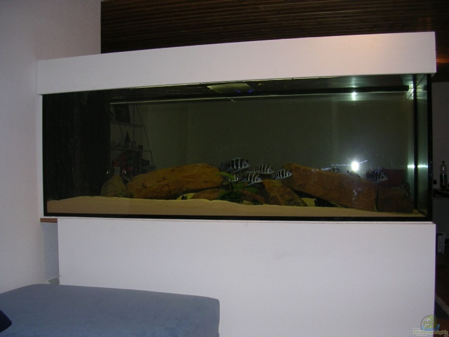 Sto??verklebt. Das Becken wurde als Raumteiler aufgestellt und ist von allen Seiten aus Wei??glas gefertigt. Der Unterbau besteht aus 4 Ytongsäulen und ist mit Reegibsplatten und Tapete wie die Wände im Raum verkleidet.