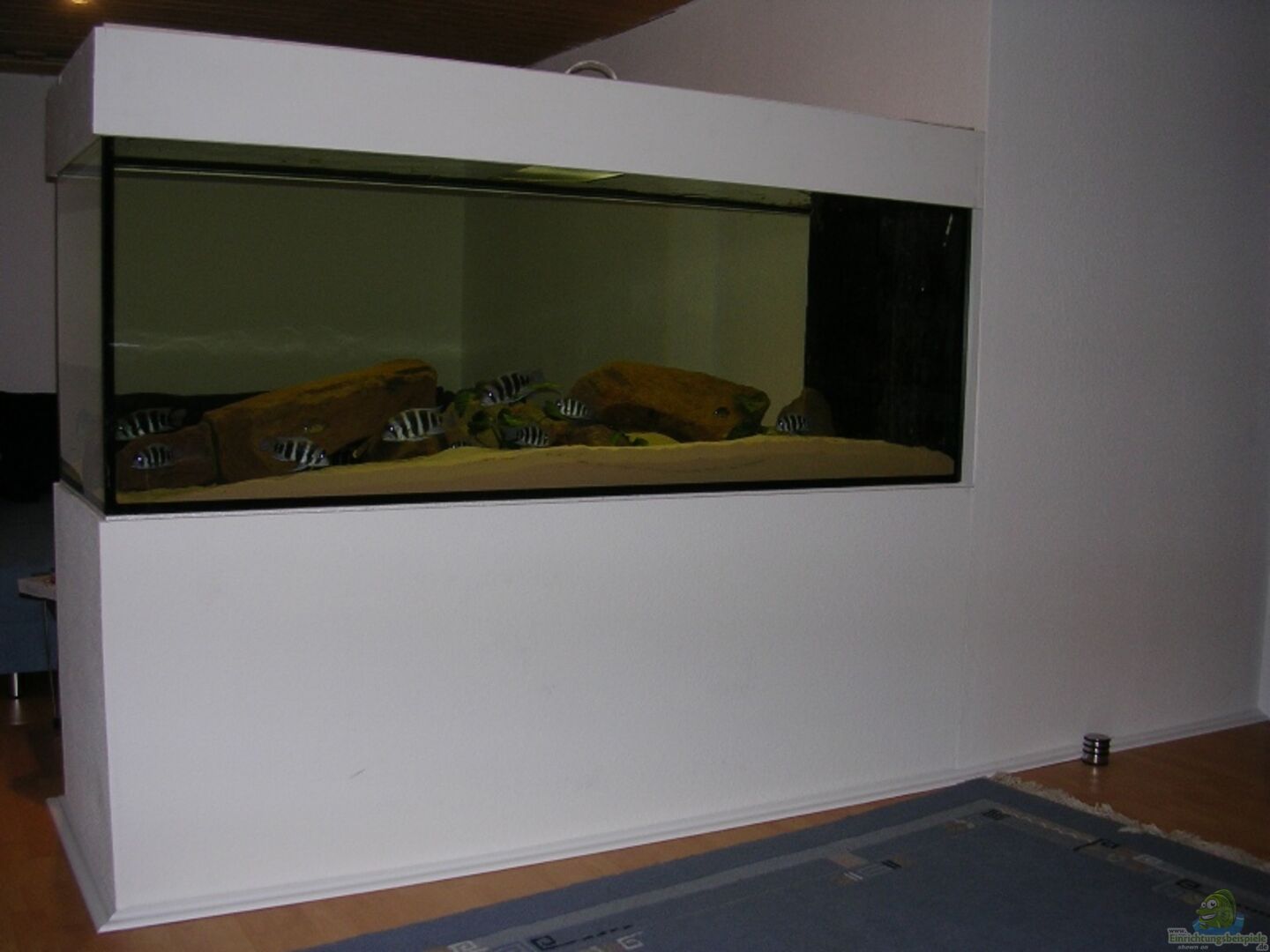 Sto??verklebt. Das Becken wurde als Raumteiler aufgestellt und ist von allen Seiten aus Wei??glas gefertigt. Der Unterbau besteht aus 4 Ytongsäulen und ist mit Reegibsplatten und Tapete wie die Wände im Raum verkleidet.