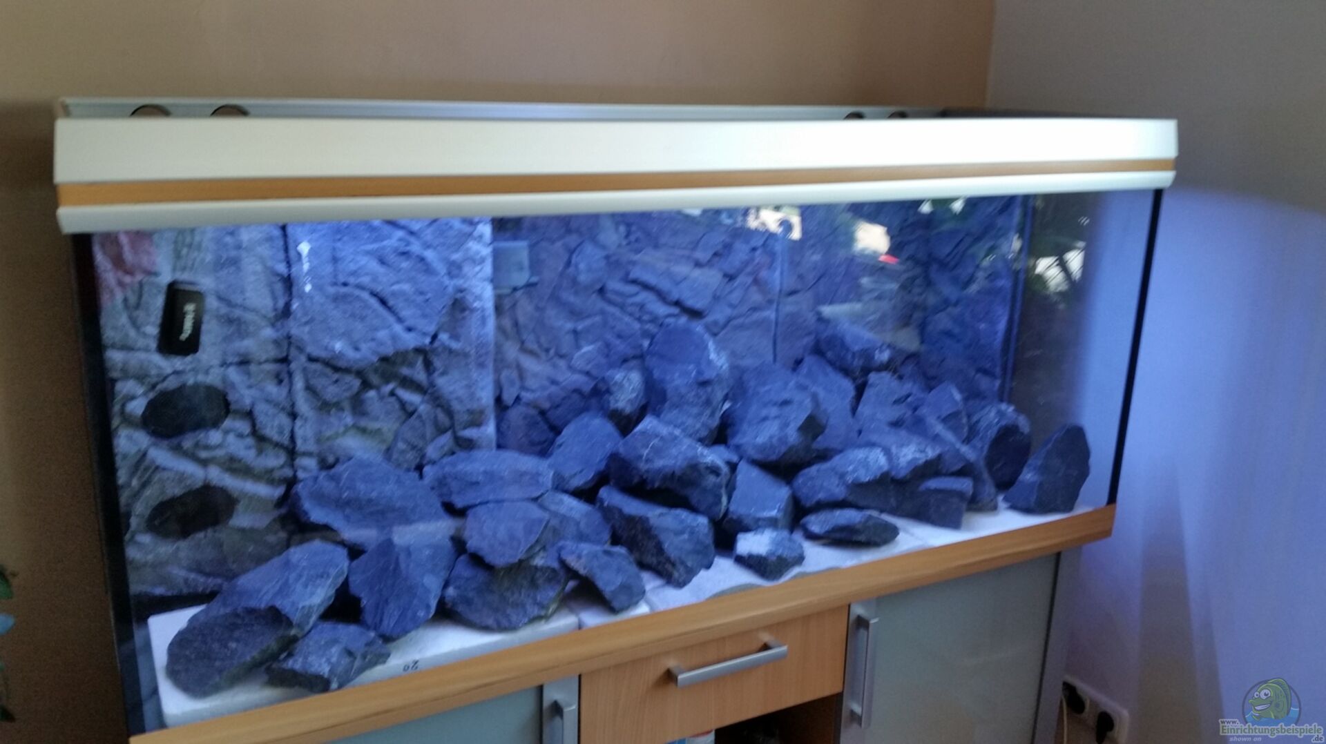 Da mir das Lochgestein nicht mehr gefällt, habe ich mich nun für Basalt entschieden. Au??erdem ist eine Rückwand von Juwel verklebt ca. 90 Kg dunkler Basalt und 20 Kg Schiefer wurde über die komplette Grundfläche verteilt. So sind jede Menge Ritzen und Höhlen entstanden. Das Aquarium wirkt jetzt meiner Meinung nach viel natürlicher.