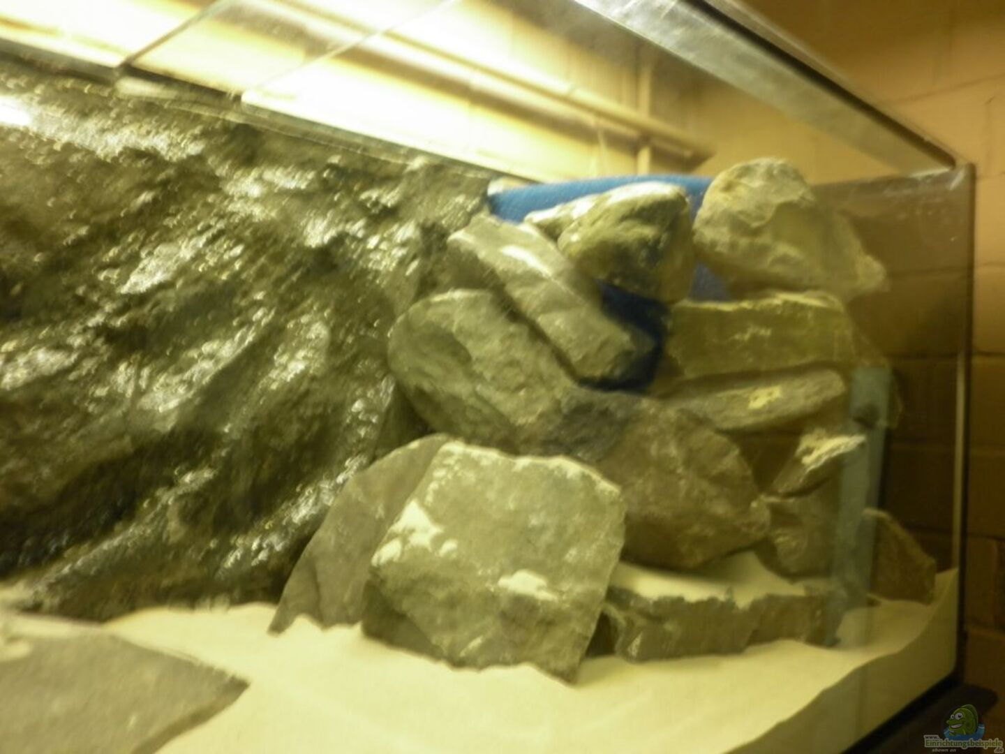 Rückwand: Eigenbau, genaueres bei Tanganjika ??bergangszone Steine: ca.100Kg ``graue Wacke`` von der Schurenbachhalde in Altenessen (graue Wacke nennt die mein Opa der die seiner zeit aus der zechengrube geholt hat) Sonstiges: Weinbergschneckenhäuser, für den Anfang ca. 30-50. Ich werde noch einige nachlegen müssen, wenn die Callipterus sich die gegenseitig klauen.