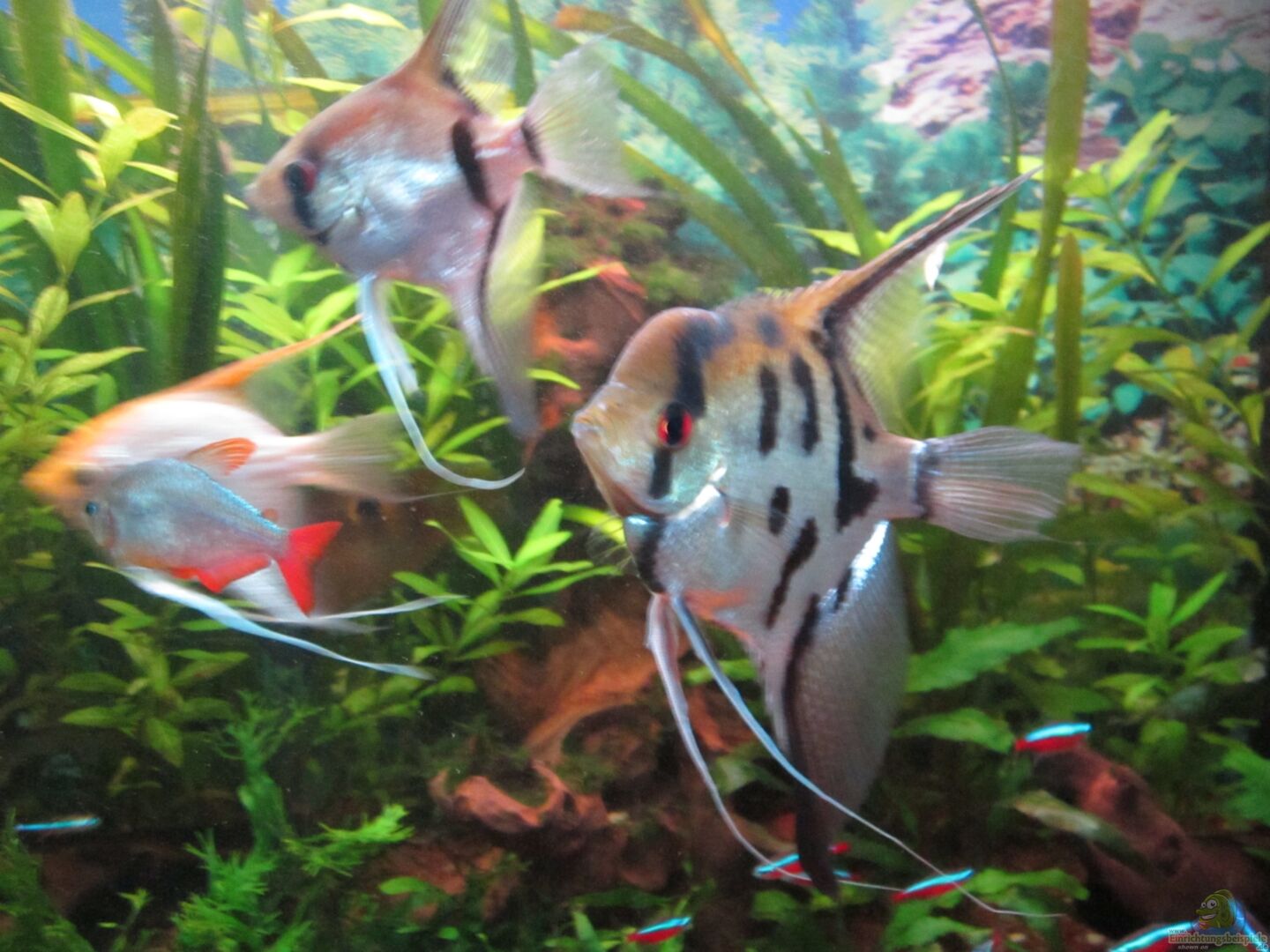 2 Pärchen Skalare die auch in regelmässigen Abständen laichen, Maronibuntbarsch 1/1 Roter Neon 20 Stk. Geschlecht unbekannt Kupfersalmler 10 Stk. Geschlecht unbekannt geflektes Dornauge 7 Stk. Geschlecht unbekannt rot blauer Kolumbianer noch 2 Stk., wird nicht aufgestockt -natürliche Auslese 1 Pärchen Ancistrus spec. Der Besatz ist seit den Anfängen 2007 unverändert, lediglich die natürliche Auslese schlägt ab und an mal zu, ich stocke nicht auf da die Besatzdichte auch [...]