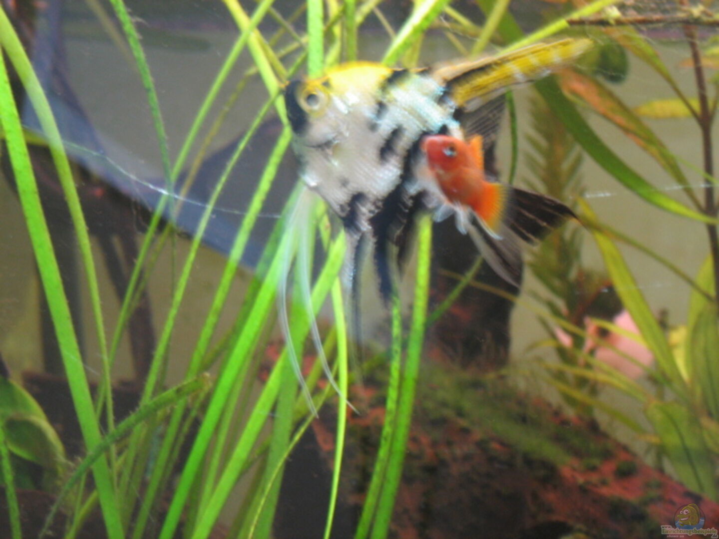 12 Kirschflecksalmler (Hyphessobrycon erythrostigma) ca. 15 Korallenplaty (Xiphophorus maculatus) 5 Zebraschmerlen (botia stritia) 2 Grüne Fransenlipper (Labeo frenatus) 2 Antennenwelse (Ancistrus dolichopterus) 1 Bratpfannenwels (Bunocephalus coracoideus) 1 Skalar und zwei drei Findlinge, welche die Langlebigkeit gegenüber ihrem damaligen Schwarm neu definieren