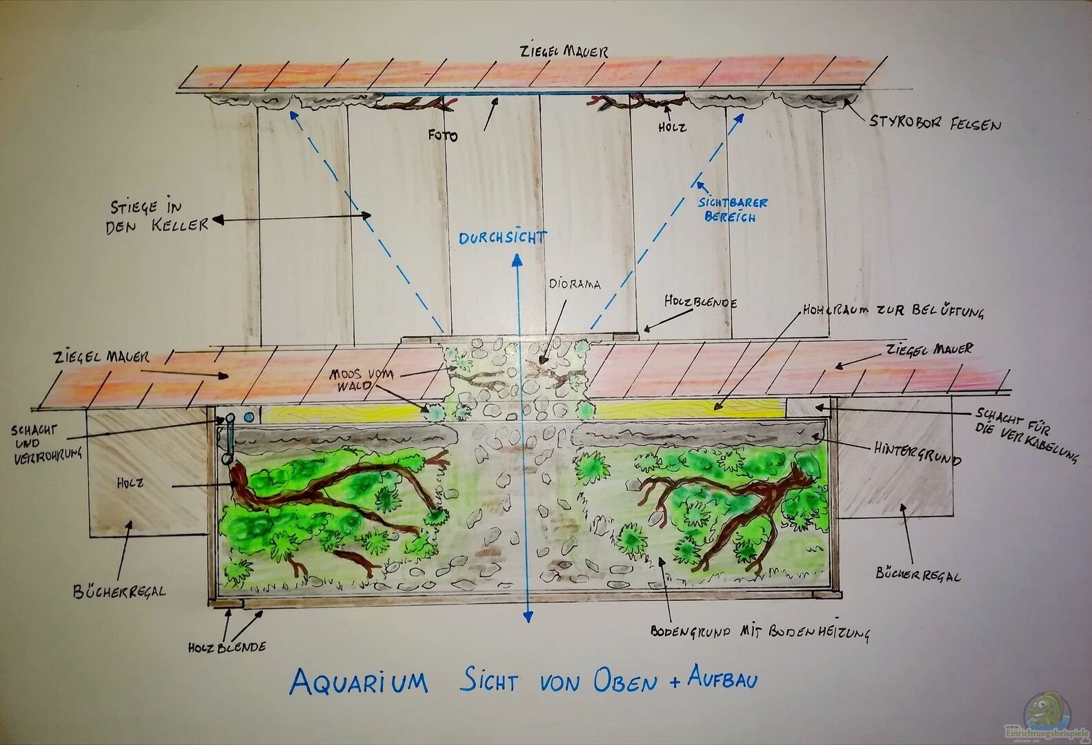 Im Filterbecken befindet sich ein zweiter kleiner Ersatz-Heizstab. Eine kleine Eheim Nanostream-Strömungspumpe aus meiner Techniksammlung versteckt hinter dem Aquariumholz dient zur besseren Durchströmung und ist am Lichtzykus mit angeschlossen. Unter dem Kasten, an der rechten Seite, befindet sich der Schlauch mit dem ich meine 3 Aquarien mit Osmose-Wasser vom Keller befülle. Der Wasserspeicher befindet sich im Heizraum, dadurch hat das Wasser schon etwas Temperatur. Zumindest im Winter, wenn [...]