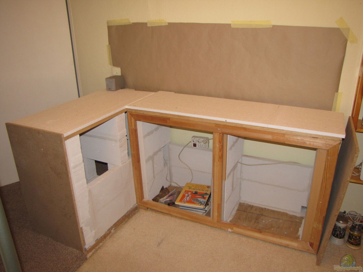 Der Unterschrank ist komplett Eigenbau , Becken Verklebung vor Ort da Spezialanfertigung.Der Aquariumbauer bekommt es sonst nicht durchs Treppenhaus. So das Becken ist bestellt und kommt am 13.02.