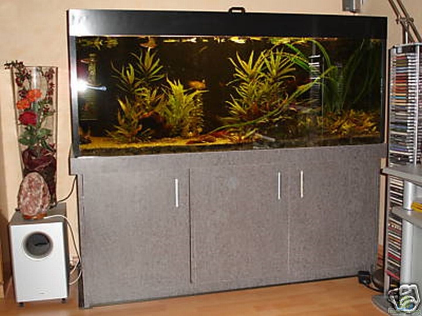 Das Becken ist von einem Aquarienbauer und ist Rundverklebt. Das Untergestell besteht aus 5 Porenbetonsteinen 20 x 24 cm worauf eine Küchenarbeitsplatte liegt.Beides ist fest miteinander verbunden.Zwischen Platte und Aquarium ist eine Moosgummimatte.Eine dünne Silikonnaht zwischen Platte und Becken damit kein Wasser drunterlaufen kann.
