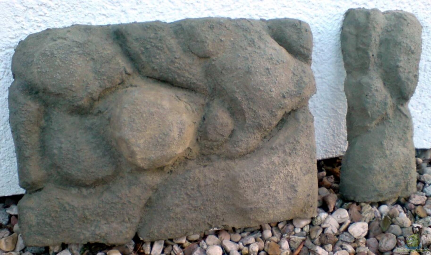 ca. 80 Schneckenhäuser (Weinbergschnecken aus dem Lebensmittelfachgeschäft) Die Betonrückwand habe ich weder farblich behandelt noch versiegelt, da auf ihr mit Sicherheit eine Menge Algen wachsen werden und Beton alkalisch ist, was den Wasserwerten nicht nur nicht schadet, sondern eher noch gut tut. Die Wand wurde auf einem Styroporträger mit Beton (1:3) modelliert und anschlie??end mit Zement sowie Sand bestreut. Das Styropor wurde ganz oder zu einem gro??en Teil geschmolzen und entfernt. [...]