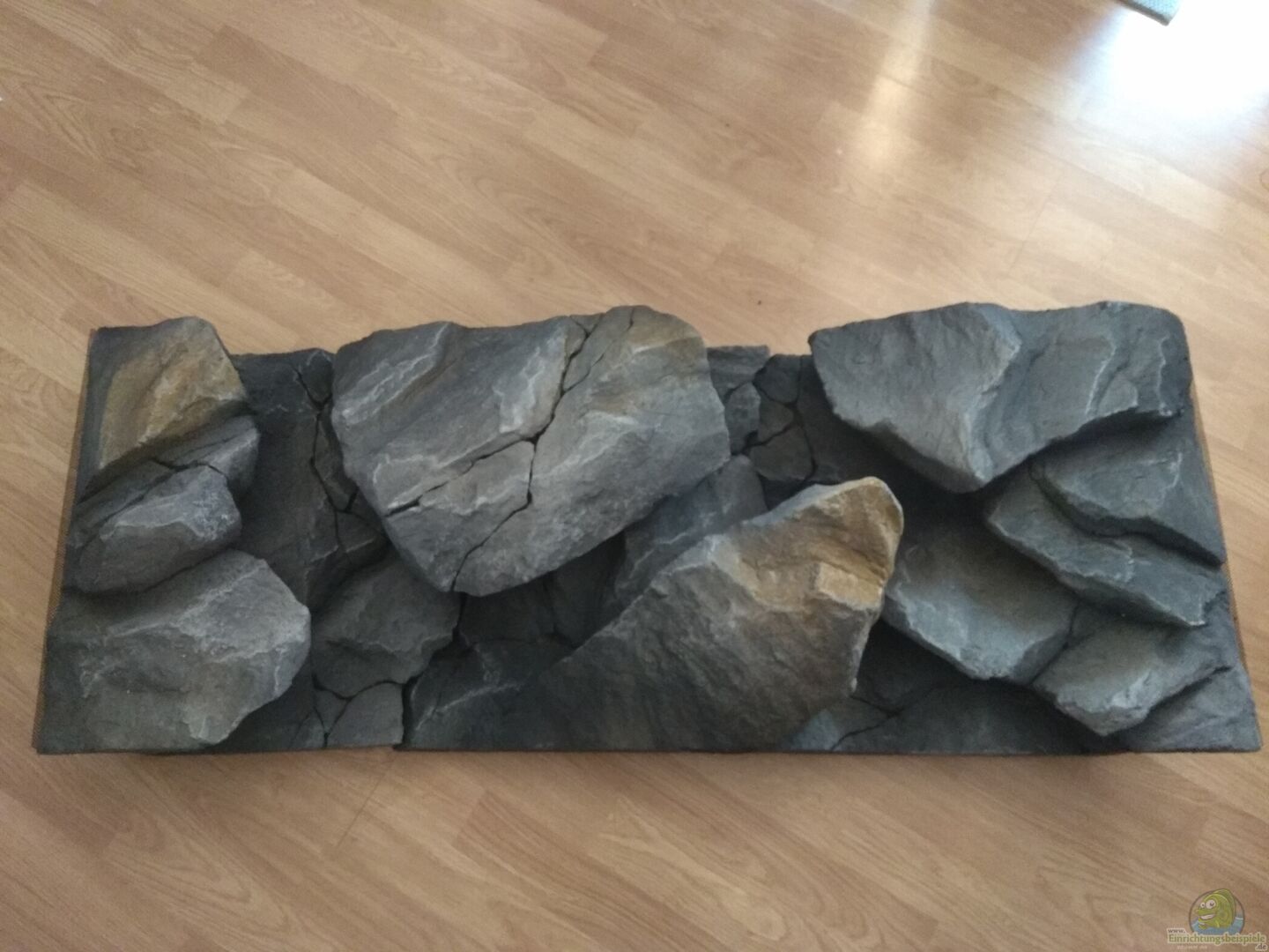 Aquariumrückwand von Aquadecor - Model A 26 Auf beiden Seiten Aussparungen für die Filtereinläufe und einen Heizstab. Auf beide Seiten ein feines Gitter um ein Hinterschwimmen zu verhindern. Diverse Steine aus umliegenden Flüssen.