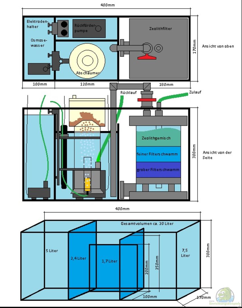 - 2 Strömungspumpen (Juwel Eccoflow 600, Leistung gesteigert mittels 1000er Impeller) 2x1000 Liter/Stunde - 1x Juwel Regelheizer 200W - Eigenbau Niveauregulierung - Sander Ozonisator Certizon C25 - Aqua Medic mV Controller - Aqua Medic pH Controller - Temperatursteuerung Lucky Reptile ThermoControl PRO II - Aqua Light Dosieranlage