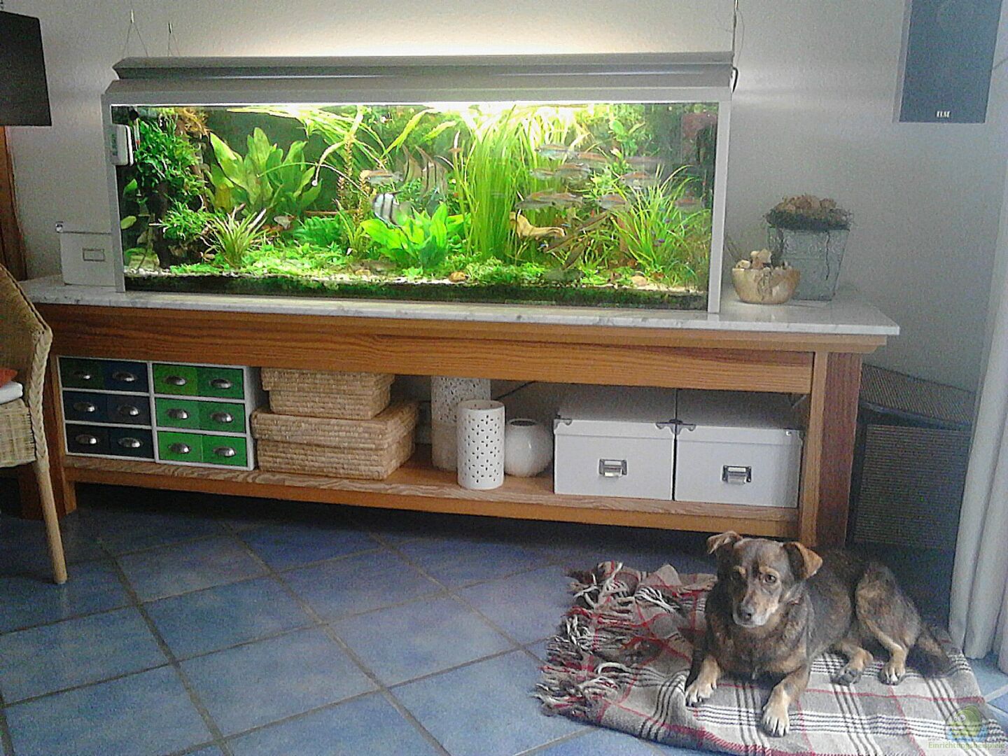 Juwel-Becken, 8 mm Float-Glas, Bodenscheibe 10 cmm Verkleidet von uns mit L-Aluschienen zur besseren Optik auf selbst gezimmertem Tisch, Filter stehen rechts und links