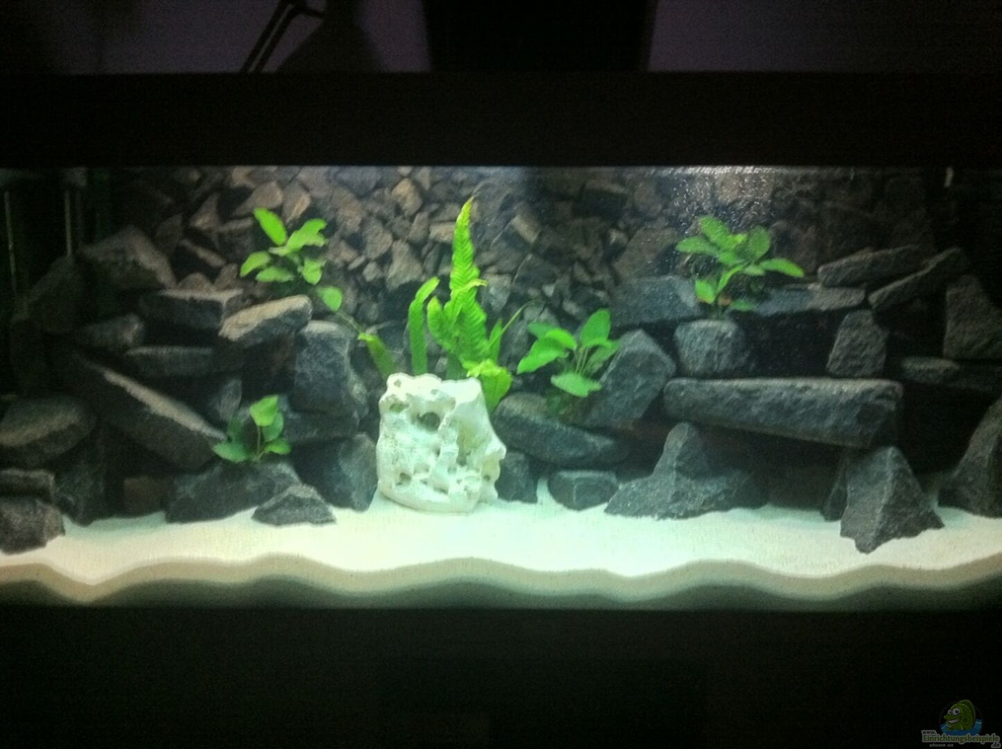 Juwel Aquarium Rio 240 mit Unterschrank -Rückwand komplett mit kleinen Basaltsteinen beklebt (Spezieller Aquariumkleber), die Steine dafür habe ich aus einer gro??en Basaltplatte geschlagen.