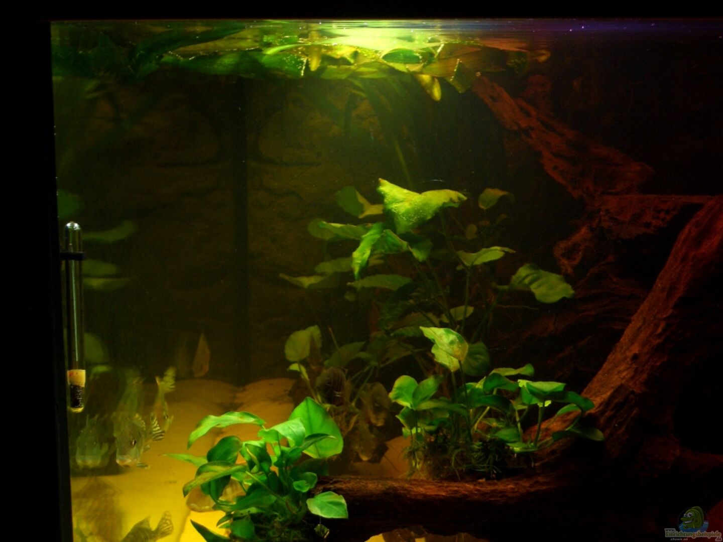 3 gro??e rote Mangrovenwurzeln (gro??e ca. 80x50, zwei kleinere ca. 40x30), diverse kleinere Mangrovenwurzeln, mehrere grö??ere und kleiner Kieselsteine, als auch diverse Steinplatten. Alles ist so angeordnet das ausreichend Schwimmraum und Reviergrenzen entstanden ist. Die grö??eren Steine sind auf einzelne Styroporplatten gestellt