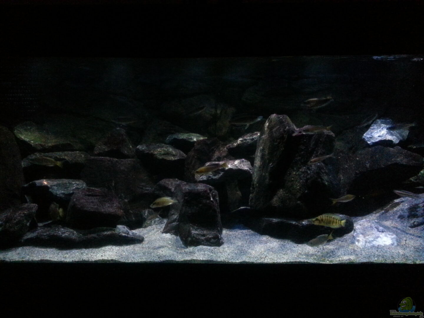 Standart Becken der marke Juwel.Rück und seiten Scheiben sind mit schwarzer Folie beklebt. Zusätzlich habe ich eine 3D rückwand verbaut die das Felstorial des Tanganjikasees wiedergeben soll.Die Rückwand steht ca.5 cm von der hinteren Scheibe ab. Das Becken hat nach abzug der Einrichting ein Wasservolumen von ca.300 liter.