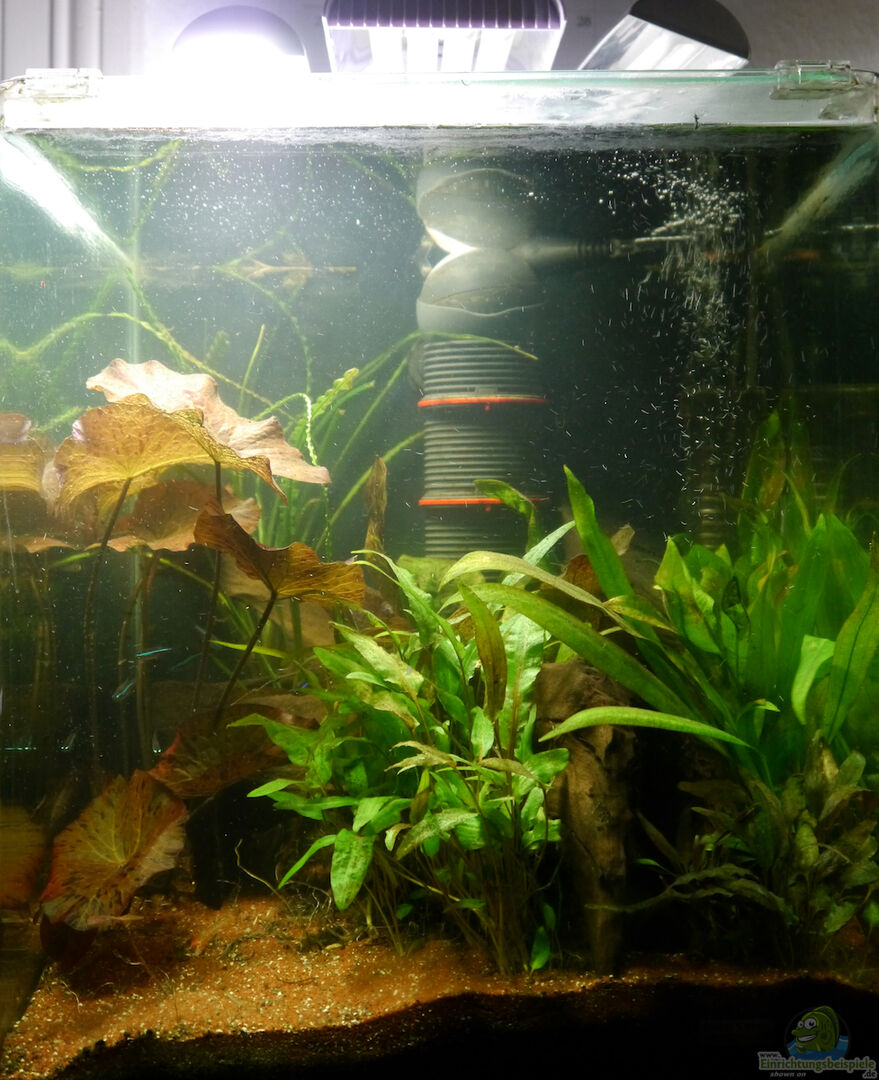 Die Heizung erfolgt durch eine Bodenheizung (JBL ProTemp basis, 10W). Während in den Sommermonaten die Herausforderung eher darin besteht, das Becken zu kühlen (habe dafür im September den NanoCoolAir Eco von Dennerle gekauft, der allerdings noch nicht zum Einsatz gekommen ist), wird die Bodenheizung im Winter durch einen 50W-Heizstab von EHEIM unterstützt. CO2-Düngung erfolgt durch das Dennerle Bio-CO2-Set (versorgt das Aquarium etwa 30 Tage lang mit CO2, wird daher einmal im Monat gewechselt) [...]